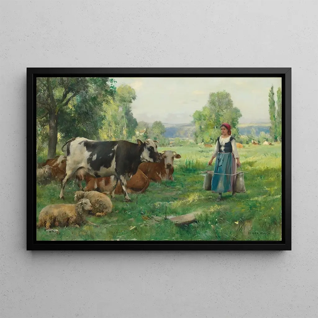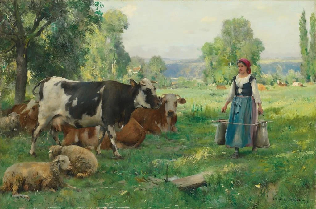 Julien Dupré, aktiv Ende des 19. Jahrhunderts, ist bekannt für seine Darstellungen des französischen Landlebens. Beeinflusst vom Impressionismus, hat er die Schönheit der Landschaften und die Einfachheit des bäuerlichen Lebens eingefangen. Seine Karriere, geprägt von besonderer Aufmerksamkeit für Details und Licht, ermöglichte es ihm, sich einen Platz unter den Künstlern seiner Zeit zu sichern. Dupré wählte häufig Szenen aus dem ländlichen Raum, wobei er die harmonische Beziehung zwischen Mensch und Natur hervorhob, was ihm eine nachhaltige Anerkennung in der Kunstwelt einbrachte.