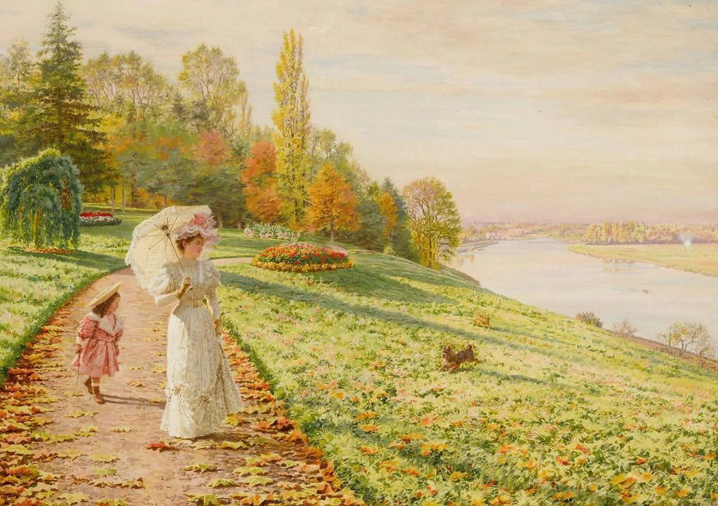 Der kunstdruck von "Promenade d'automne" taucht ein in ein lebendiges Gemälde mit warmen, schimmernden Farben. Marie-François Firmin-Girard fängt mit Bravour die Essenz des Herbstes ein, wo goldene und rote Blätter sanft von den Bäumen fallen und einen bunten Teppich auf den Boden legen. Das sanfte, diffuse Licht erhellt die Szene und hebt die Nuancen jedes Laubs hervor. Dieses Gemälde vermittelt eine Atmosphäre sanfter Melancholie und lädt den Betrachter ein, in dieser verzauberten Landschaft spazieren zu gehen, auf der Suche nach der vergänglichen Schönheit der Natur.