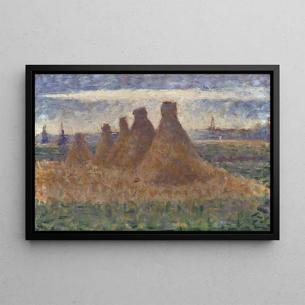 Heuballen: eine Ode an Licht und Natur Die "Heuballen" von Georges Seurat fangen das Wesen einer ländlichen Landschaft im Licht ein. Mit einer Palette lebendiger Farben nutzt der Künstler die Pointillismus-Technik, um eine ruhige und poetische Atmosphäre zu schaffen. Die mit Präzision aufgetragenen Farbkleckse bilden eine harmonische Komposition, in der die Ballen majestätisch unter einem Sommerhimmel emporragen. Das Werk vermittelt ein Gefühl der Ruhe und lädt den Betrachter ein, in diese idyllische Szene einzutauchen, in der die Zeit stillzustehen scheint. Georges Seurat: Pionier des Neo-Impressionismus Georges Seurat, geboren 1859, ist ein bedeutender Künstler der neo-impressionistischen Bewegung, bekannt für seine innovative Technik und seinen wissenschaftlichen Ansatz zur Farbe. Beeinflusst von Künstlern wie Delacroix und den Farbtheorien von Chevreul, suchte Seurat die Effekte von Licht und Farbe auf die visuelle Wahrnehmung zu erforschen. Seine produktivste Phase, am Ende des 19. Jahrhunderts, markierte einen Wendepunkt in der Kunstgeschichte und legte die Grundlagen des Modernismus. Die "Heuballen" zeugen von seinem Genie, das sorgfältige Beobachtung mit künstlerischem Ausdruck verbindet. Eine dekorative Anschaffung mit vielfältigen Vorteilen Die Wahl einer Kunstdruck-Reproduktion der "Heuballen" von Seurat bedeutet, eine Leinwand zu wählen, die Ihr Interieur durch ihren zeitlosen Charme bereichert. Ob im Wohnzimmer, Büro oder Schlafzimmer – dieses Werk bringt einen Hauch von Natur und Ruhe in Ihre Dekoration. Die Reproduktionsqualität garantiert eine Treue zu den Farben und Details, sodass Sie die Ästhetik des Originals voll genießen können. Mit ihrer visuellen Anziehungskraft ist diese Reproduktion eine ideale Wahl für alle, die Kunst und Dekoration verbinden möchten und dabei das Erbe eines Meisters des Impressionismus feiern.