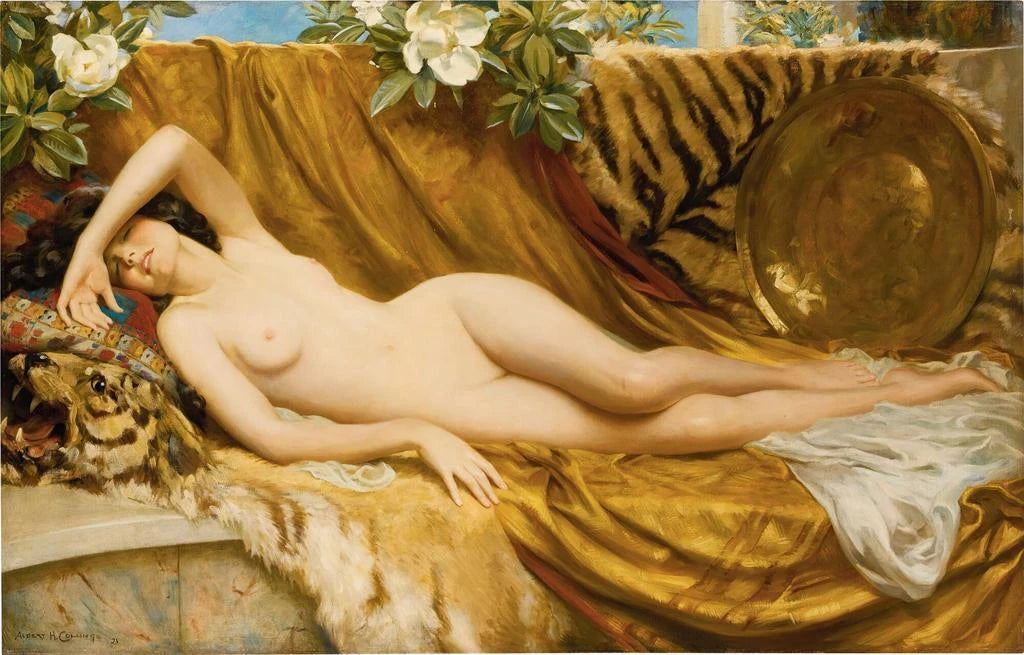 Die kunstdruck von Albert Henry Collings ist ein faszinierendes Werk, das die Majestät der Tierwelt evoziert. Die Komposition, reich an Details, zeigt einen majestätischen Tiger, dessen lebendige Streifen sich mit goldenen und braunen Tönen vermischen. Die Technik von Collings, die Realismus und impressionistische Akzente verbindet, schafft eine Atmosphäre, die zugleich dynamisch und ruhig ist. Die Lichtspiele auf dem Fell des Tieres verleihen eine beeindruckende Tiefe und laden den Betrachter ein, in diese wilde Welt einzutauchen. Jeder Pinselstrich scheint eine Geschichte zu erzählen, die eines Königs des Dschungels, sowohl mächtig als auch verletzlich.