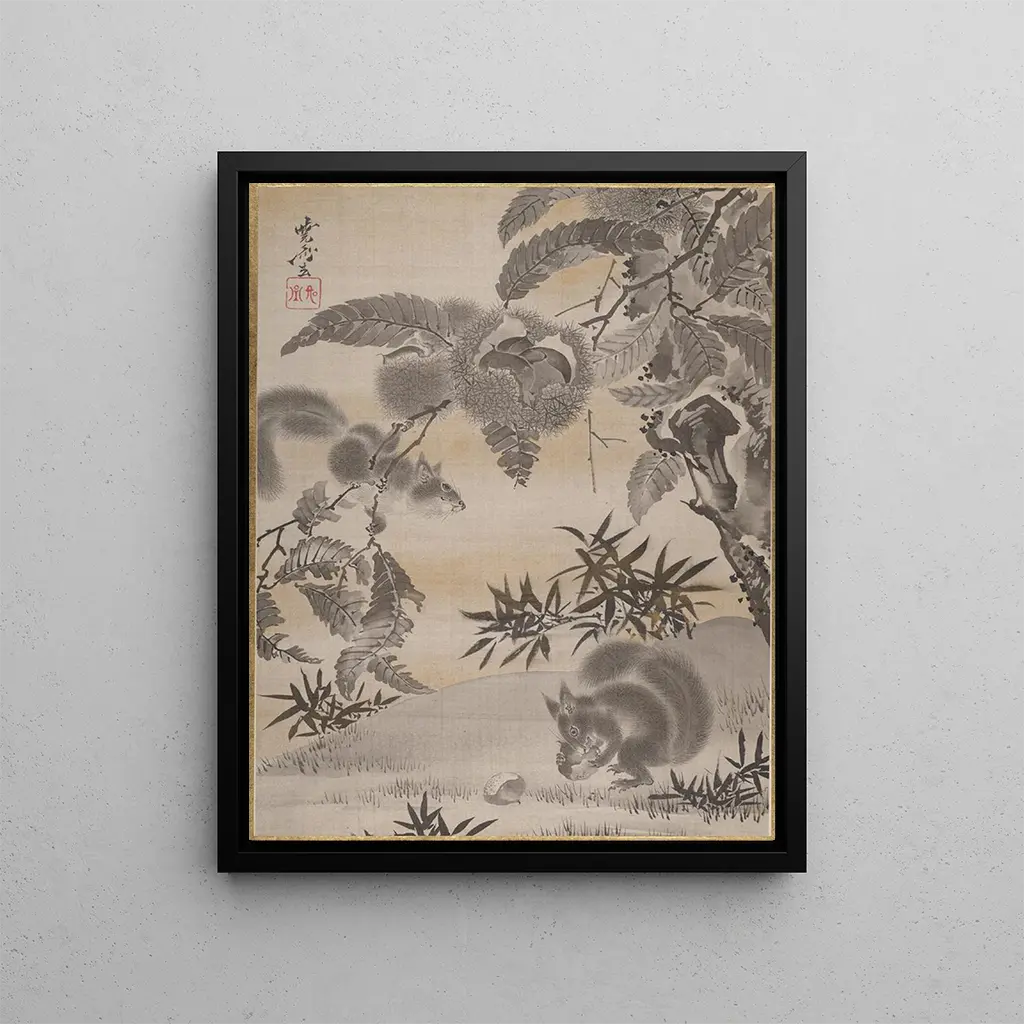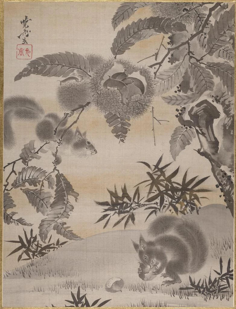 Eichhörnchen, die Kastanien sammeln - Kawanabe Kyōsai