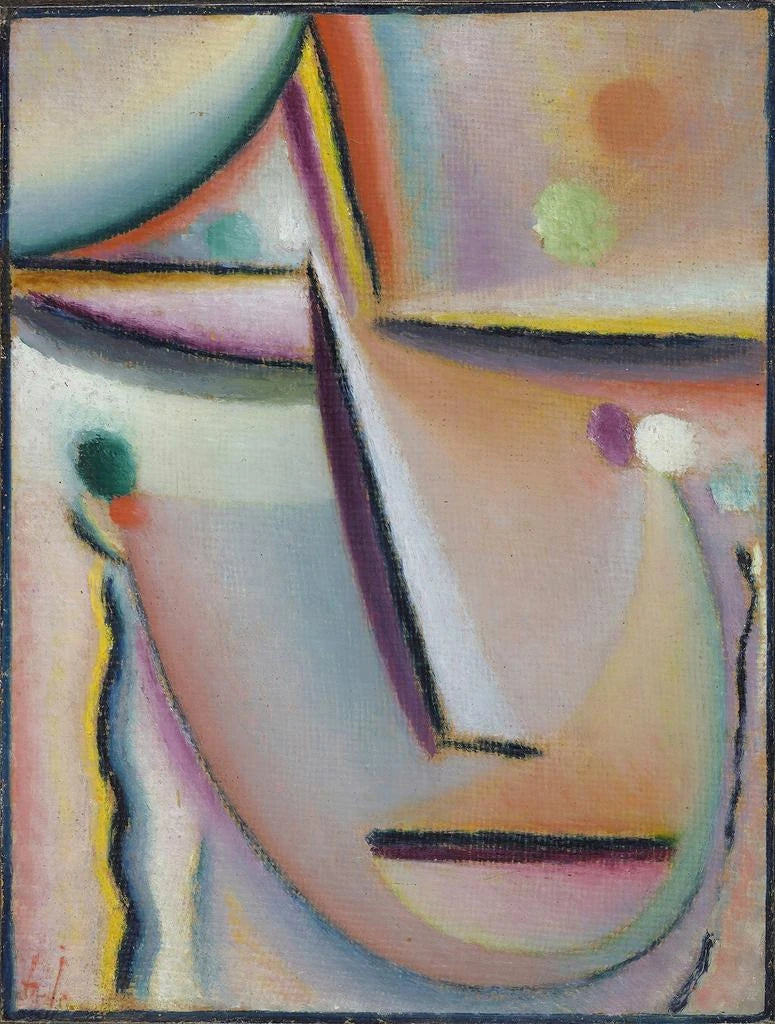 "Méditation La Prière" ist eine perfekte Illustration des charakteristischen Stils von Jawlensky, der Abstraktion und Spiritualität vereint. Die lebendigen Farben und stilisierten Formen zeugen von einer ständigen Suche nach der Essenz menschlicher Emotionen. Die Art, wie der Künstler reiche Töne und auffällige Kontraste nutzt, schafft eine Atmosphäre, die sowohl beruhigend als auch dynamisch ist. Die Gesichter, oft verzerrt, transzendieren ihr physisches Erscheinungsbild, um Symbole der Seele auf der Suche nach innerem Frieden zu werden. Dieses Werk, mit seinen fließenden Linien und meditativen Tönen, lädt zu einer tiefen Selbstreflexion ein und ermöglicht jedem, sich mit den eigenen Gedanken und Bestrebungen zu verbinden.