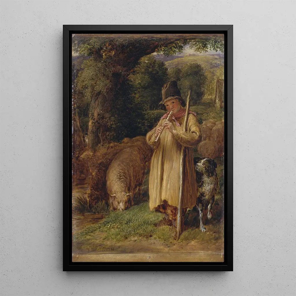 In diesem fesselnden Werk spielt der junge Hirte mit ruhigem Gesichtsausdruck Flöte, umgeben von der Sanftheit einer ländlichen Landschaft. Die sanften und natürlichen Farben, die von beruhigenden Grüntönen bis zu warmen Brauntönen reichen, schaffen eine Atmosphäre von Ruhe und Harmonie. Die Technik von John Linnell, die geschickt Realismus mit einer romantischen Note verbindet, lädt den Betrachter ein, in diesen schwebe Moment einzutauchen. Die detaillierten Kleidungsstücke des Hirten und die natürlichen Elemente der Umgebung zeugen von einem aufmerksamen Blick für die Schönheit der ländlichen Welt und rufen eine tiefe Verbindung zwischen Mensch und Natur hervor.