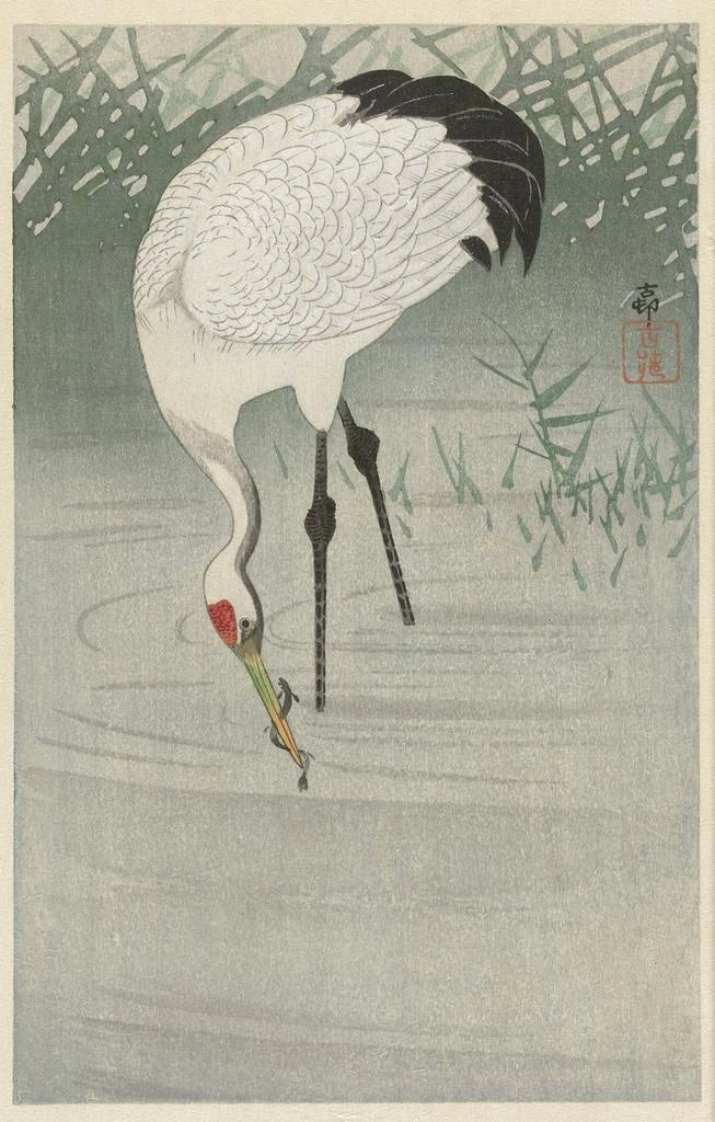 Kunstdruck | Kranich beim Fischen im flachen Wasser - Ohara Koson