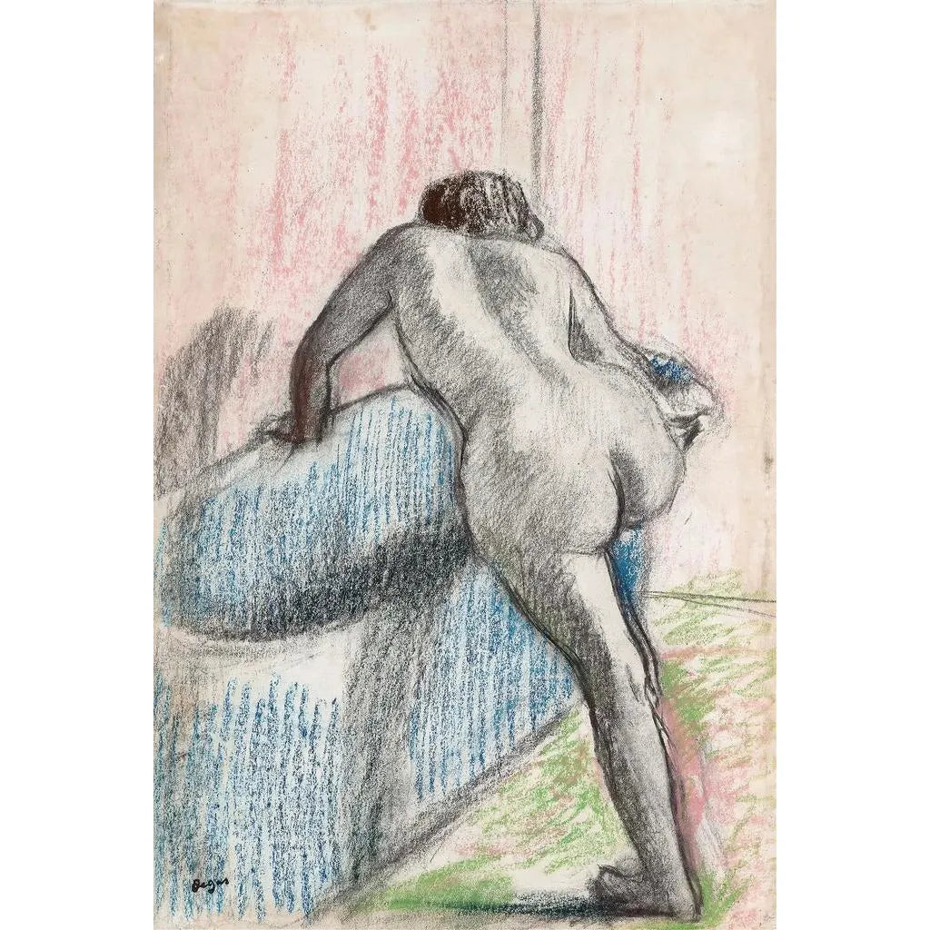 In diesem ikonischen Werk fängt Edgar Degas einen Moment der Ruhe und Intimität ein, dargestellt durch eine Frau, die ein Bad nimmt. Die sanften Farben und Lichtnuancen schaffen eine beruhigende Atmosphäre, während die Komposition die zarte Kurve des weiblichen Körpers betont. Die Pastelltechnik, die Degas verwendet, ermöglicht es, die Textur des Wassers und die Sanftheit der Haut mit großer Feinheit wiederzugeben. Dieses Gemälde vermittelt ein Gefühl von Gelassenheit und lädt den Betrachter ein, in diesen Moment des Alltags einzutauchen, während es die Schönheit des menschlichen Körpers feiert.