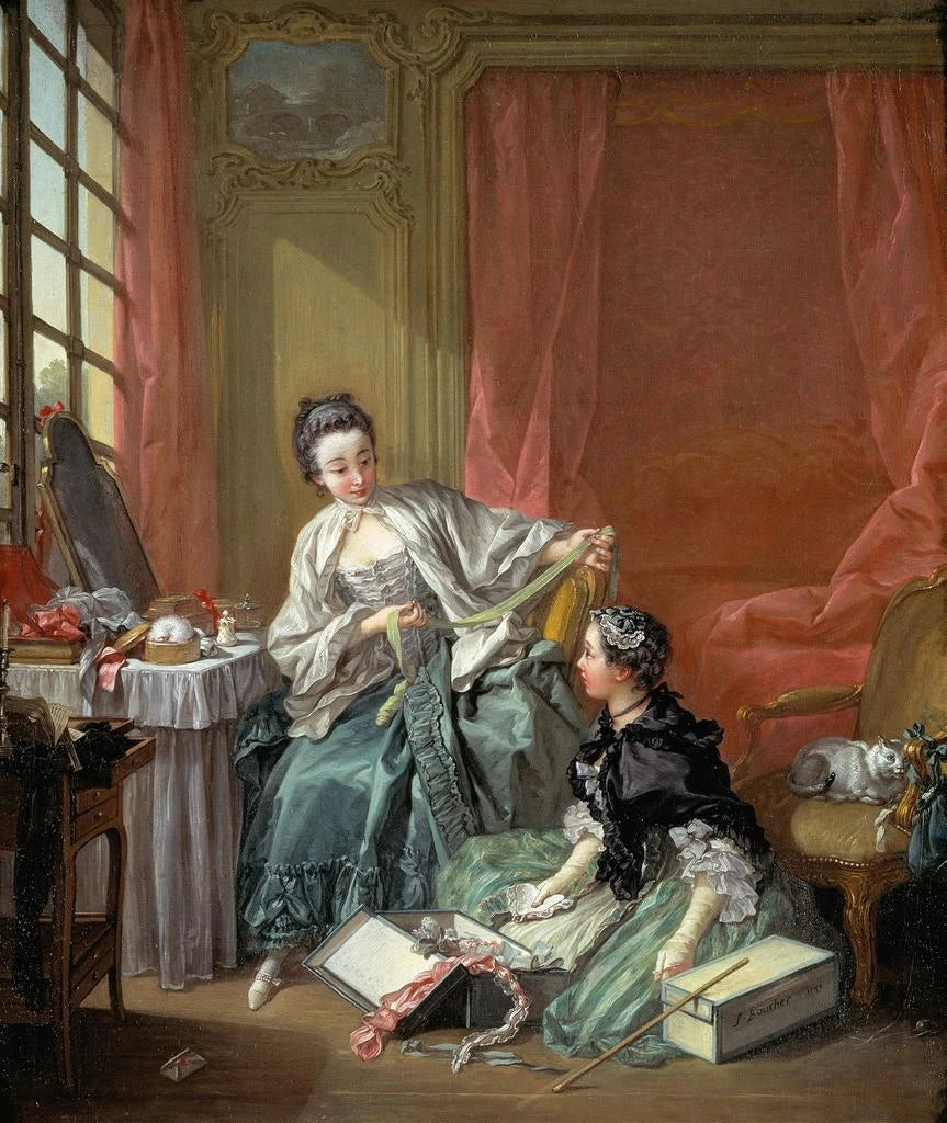 Reproduktion La modiste - François Boucher – Einführung fesselnd In der bezaubernden Welt des Rokoko-Kunsts hebt sich das Werk "La modiste" von François Boucher durch seine Eleganz und Zartheit hervor. Gemalt im 18. Jahrhundert, evoziert diese Leinwand nicht nur die Mode der damaligen Zeit, sondern auch den Geist einer Gesellschaft im Aufschwung. Der Künstler taucht uns durch diese Darstellung in eine Welt ein, in der Schönheit und Leichtfertigkeit miteinander verschmelzen, und bietet einen faszinierenden Einblick in das tägliche Leben der Frauen seiner Zeit. Die Szene, zugleich intim und raffiniert, fesselt die Aufmerksamkeit und lädt zu einer längeren Betrachtung ein, die die Feinheiten menschlicher Emotionen und sozialer Interaktionen offenbart. Stil und Einzigartigkeit des Werks Der Stil von Boucher ist sofort erkennbar, geprägt von sanften und leuchtenden Farben, runden Formen und einer kunstvoll orchestrierten Komposition. "La modiste" bildet keine Ausnahme von dieser Regel. Die Pastellpalette, mit ihren Nuancen von Rosa, Blau und Creme, vermittelt eine Atmosphäre von Leichtigkeit und Traum. Die minutösen Details der Kleidung und Accessoires zeugen von einer außergewöhnlichen Meisterschaft des Pinsels, während der Ausdruck der Figuren, zwischen Freude und Melancholie, eine emotionale Tiefe der Szene hinzufügt. Jedes Element, vom Hut bis zur Haube, ist sorgfältig arrangiert, um eine visuelle Harmonie zu schaffen, die den Betrachter in einen schwebe Moment versetzt. Dieses Gemälde verkörpert perfekt die Leichtigkeit und Raffinesse der Damen jener Zeit, während es gleichzeitig die ästhetischen und sozialen Anliegen eines privilegierten Milieus offenbart. Der Künstler und sein Einfluss François Boucher, geboren 1703, ist einer der emblematischsten Maler des französischen Rokoko. Seine Karriere, geprägt von Erfolg, stellt ihn ins Zentrum des künstlerischen Lebens seiner Zeit. Als Hofmaler verstand er es, das Wesen des aristokratischen Geschmacks einzufangen, und beeinflusste nicht nur seine Zeitgenossen, sondern auch zukünftige Generationen. Sein Stil, gekennzeichnet durch eine unvergleichliche Sinnlichkeit und Leichtigkeit, ebnete den Weg für zahlreiche Künstler, während er die Grundlagen einer Ästhetik legte, die über seine Epoche hinaus Bestand haben wird. "La modiste" reiht sich in diese Linie ein und illustriert die Anliegen und Bestrebungen einer Gesellschaft auf der Suche nach