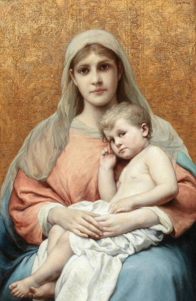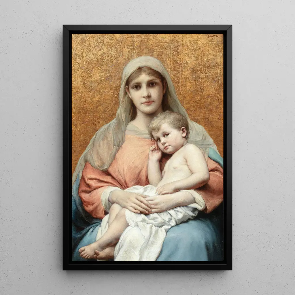 In diesem ikonischen Werk zeigt Gabriel von Max die Jungfrau Maria, die das Jesuskind in einem Moment der Sanftheit und Gelassenheit hält. Die Komposition ist geprägt von warmen, leuchtenden Farben, die das göttliche Licht und die mütterliche Wärme hervorrufen. Die detaillierten Gesichtszüge und Kleidungsstücke zeugen von der technischen Meisterschaft des Künstlers, während der verschwommene Hintergrund die Aufmerksamkeit auf diese heilige Szene lenkt. Die Atmosphäre, die von diesem Gemälde ausgeht, ist von Frieden und Spiritualität durchdrungen und lädt den Betrachter zu stiller Kontemplation ein.