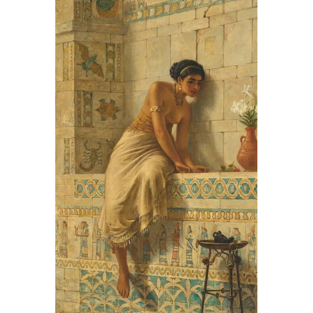 In dem Werk "Thisbé" fängt Edwin Long einen Moment dramatischer Spannung und intensiver Emotionen ein. Die Komposition zeigt die berühmte Legende von Pyramus und Thisbé, bei der das sanfte Licht die Gesichter der Protagonisten beleuchtet und ihre Traurigkeit betont. Die warmen Farben und die detaillierten Kleidung- und Mimik-Details vermitteln eine Atmosphäre, die sowohl romantisch als auch tragisch ist. Die Ölmaltechnik, die Long meisterhaft beherrscht, verleiht dieser mythologischen Szene Leben und lädt den Betrachter ein, die Tiefe der Gefühle zu spüren, die die beiden Liebenden verbinden.