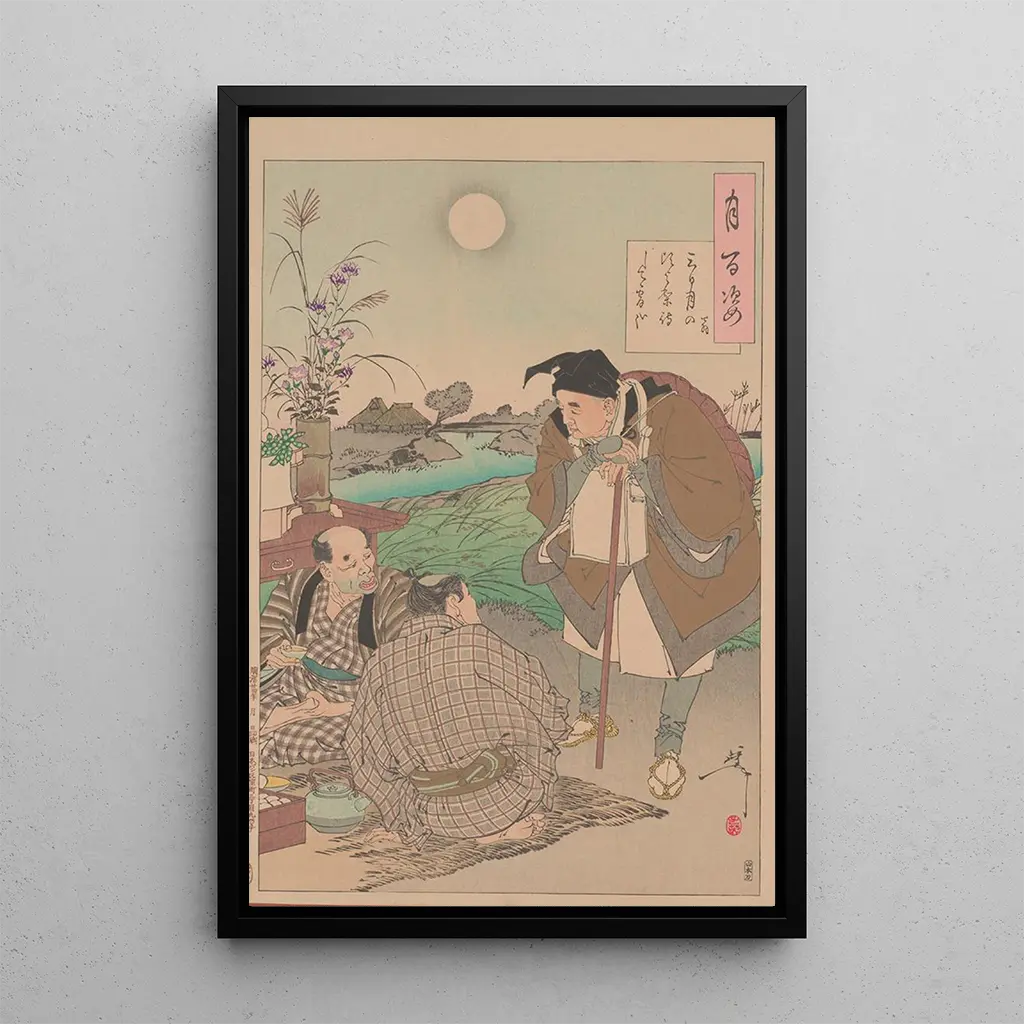 In diesem fesselnden Werk taucht Tsukioka Yoshitoshi in eine nächtliche Szene ein, in der sich Bauern versammeln, um den Herbstmond zu feiern. Die reichen und lebendigen Farben, die von tiefem Blau bis zu schimmerndem Gold reichen, schaffen eine Atmosphäre, die sowohl ruhig als auch festlich ist. Die Ukiyo-e-Printtechnik, charakteristisch für die japanische Kunst, wird durch detaillierte Feinheiten und fließende Linien hervorgehoben, die den Figuren und ihrer Umgebung Leben einhauchen. Diese reproduction des Gemäldes "Paysans célébrant la lune d'automne" vermittelt eine tiefe Verbindung zur Natur und zu alten Traditionen und lädt den Betrachter ein, sich in diese poetische Feier einzutauchen.