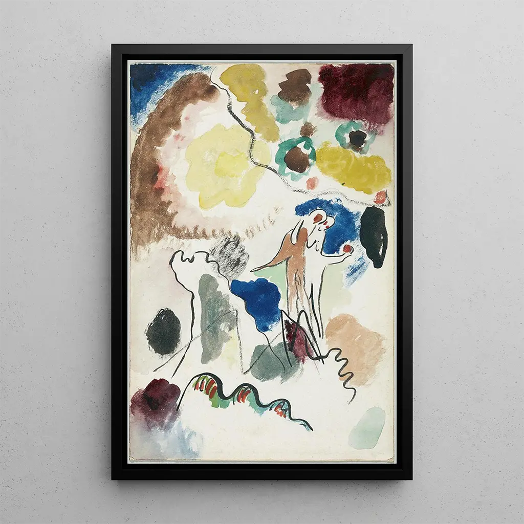 In "Paradies" taucht Wassily Kandinsky in eine Welt ein, in der Farben und Formen sich verflochten, um eine mystische und fesselnde Atmosphäre zu schaffen. Dieses Werk, das 1910 entstanden ist, zeichnet sich durch seine leuchtenden Farbtöne und dynamischen Kompositionen aus, die auf der Leinwand zu tanzen scheinen. Die abstrakten Formen rufen tiefe Emotionen hervor und laden den Betrachter zu einer introspektiven Betrachtung ein. Die Öltechnik auf Leinwand ermöglicht es Kandinsky, die Grenzen der Abstraktion zu erforschen, während er gleichzeitig ein Gefühl von Freiheit und spiritueller Erhebung vermittelt, als ob jeder Pinselstrich eine Note in einer visuellen Symphonie wäre.