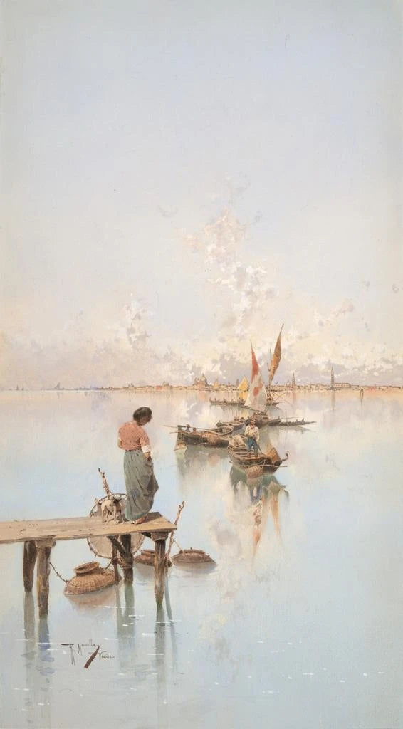 Raffaele Mainella, Maler des 20. Jahrhunderts, ist bekannt für seine Stadtlandschaften und Szenen des Alltagslebens, mit besonderem Schwerpunkt auf Venedig. Sein Stil, beeinflusst vom Postimpressionismus, zeichnet sich durch dynamische Pinselstriche und eine Palette lebendiger Farben aus. Mainella hat die Essenz von Venedig eingefangen, einer Stadt voller Geschichte und Kultur, indem er ihre Kontraste und ihre zeitlose Schönheit hervorhebt. Sein Werk ist ein Zeugnis für die Bedeutung der Stadt in der italienischen Kunst, und er inspiriert weiterhin zeitgenössische Künstler.