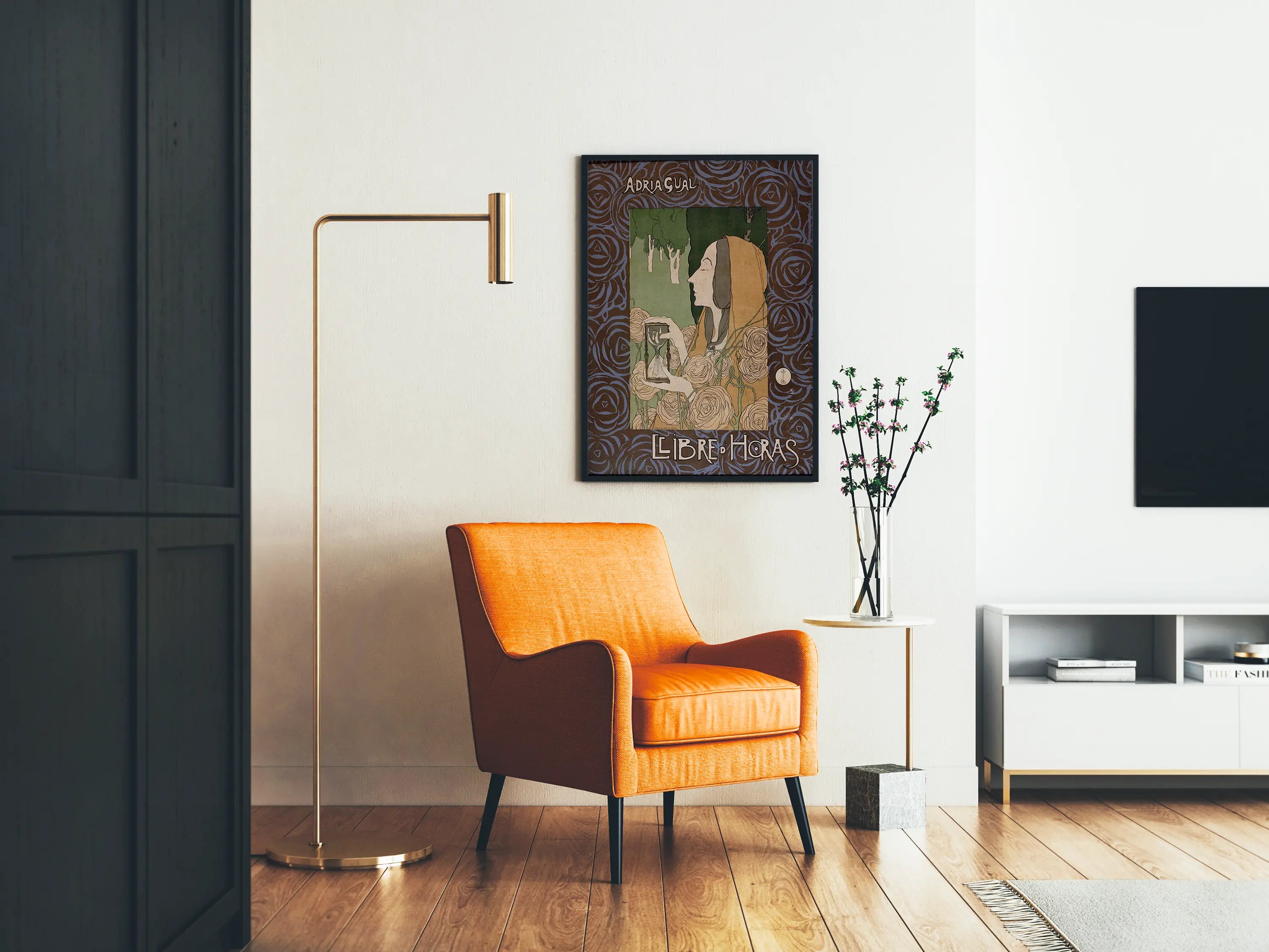 Dieses Wanddekorplakat mit dem Titel „Libre d'Horas“ ist ein ikonisches Werk im Jugendstil, signiert von Adrià Gual. Es zeigt eine zarte und elegante Komposition: eine weibliche Figur mit feinem Profil, gekleidet in einen ockerfarbenen Schleier und umgeben von stilisierten Rosen, hält eine Sanduhr, die auf subtile Weise die vergehende Zeit symbolisiert. Der grüne Hintergrund mit stilisierten Bäumen bietet einen beruhigenden Kontrast zu dem mit geschwungenen floralen Mustern verzierten Rahmen in Brauntönen und Blau, typische Merkmale des Jugendstils. Dieses dekorative Plakat ist ideal, um einem modernen oder klassischen Interieur eine künstlerische und raffinierte Note zu verleihen. Es eignet sich perfekt als Wandposter, Druck, um Wohn- oder Arbeitsräume zu verschönern, und bietet eine Balance zwischen floraler Ästhetik, zeitlicher Symbolik und weiblicher Eleganz. Sein sanftes Design mit geschwungenen Linien und seiner harmonischen Farbpalette fügt sich in eine Wanddekoration ein, die die Geschichte der Kunst und die Feinheit der Details hervorhebt. Es passt gleichermaßen in Wohnzimmer, Schlafzimmer oder Büro und schafft eine poetische und inspirierende Atmosphäre. Dieses dekorative Poster lädt zu ruhiger Betrachtung und Reflexion über die Zeit ein – eine zeitlose und universelle Wertschätzung, die es zu einem besonderen Stück für Kunstliebhaber und anspruchsvolle Wanddekoration macht.