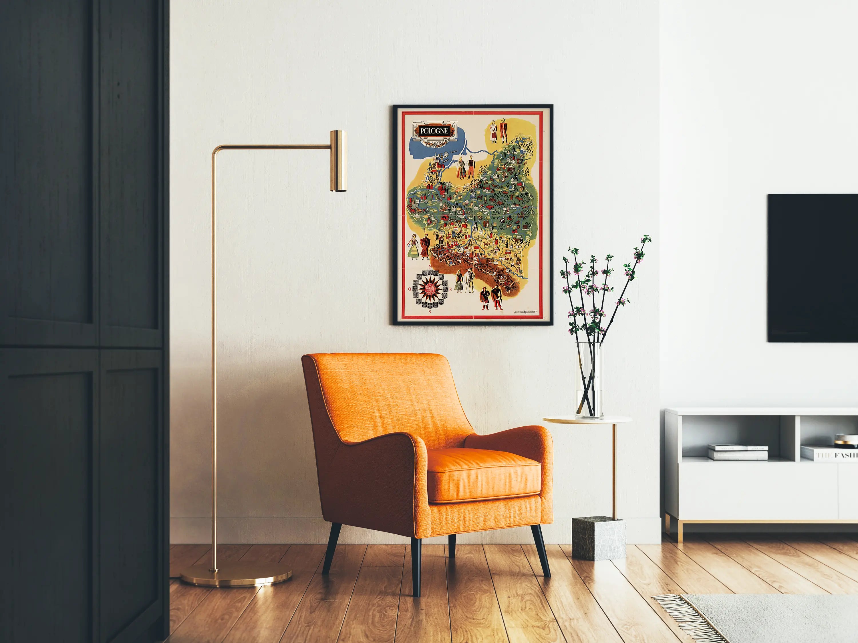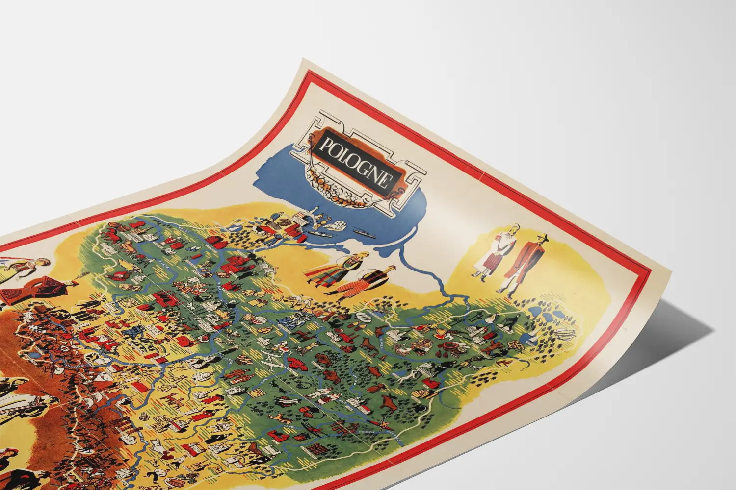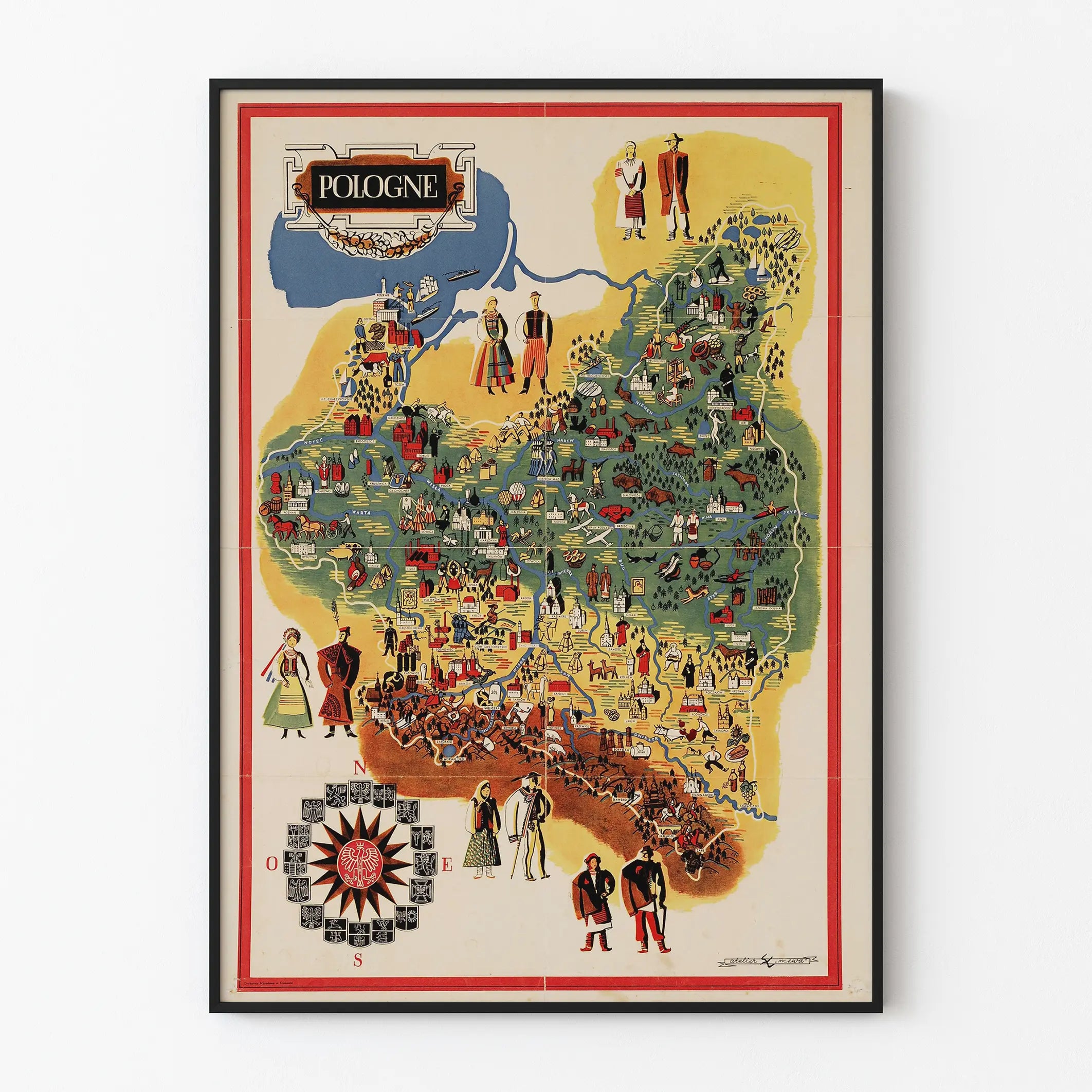 Rund um die Karte rahmt ein roter Rahmen das Gesamtbild, hebt die Komposition hervor und verleiht diesem Poster im traditionellen Stil eine elegante Note. Unten links integriert eine dekorative Kompassrose Wappen und einen stilisierten Adler, die die nationale Identität Polens symbolisieren. Die grafische Gestaltung lädt zur visuellen Entdeckung ein: kleine Tiere, handwerkliche Aktivitäten, festliche Szenen und Wintersportarten sind präsent und unterstreichen den dokumentarischen und spielerischen Charakter des Bildes.