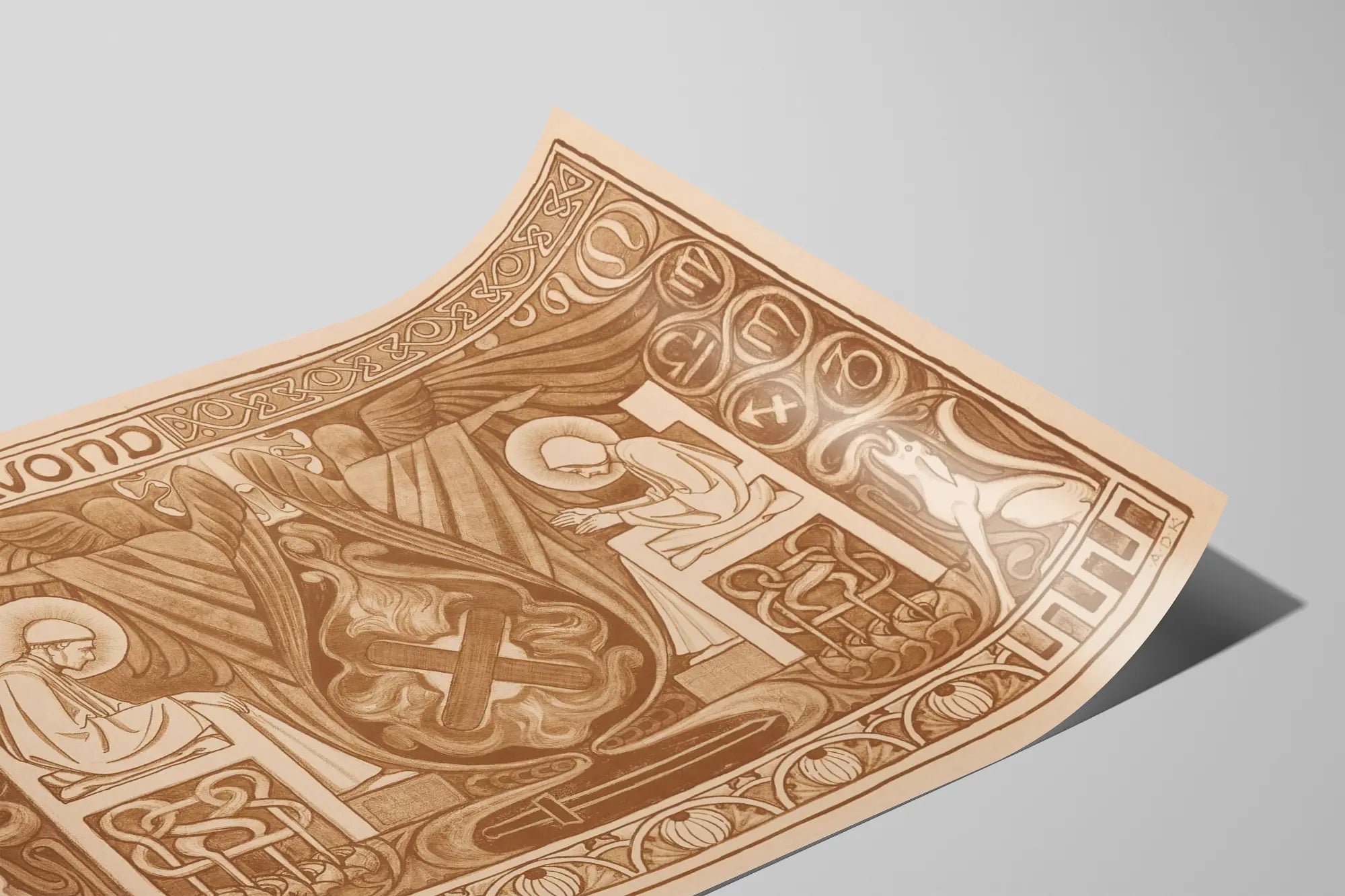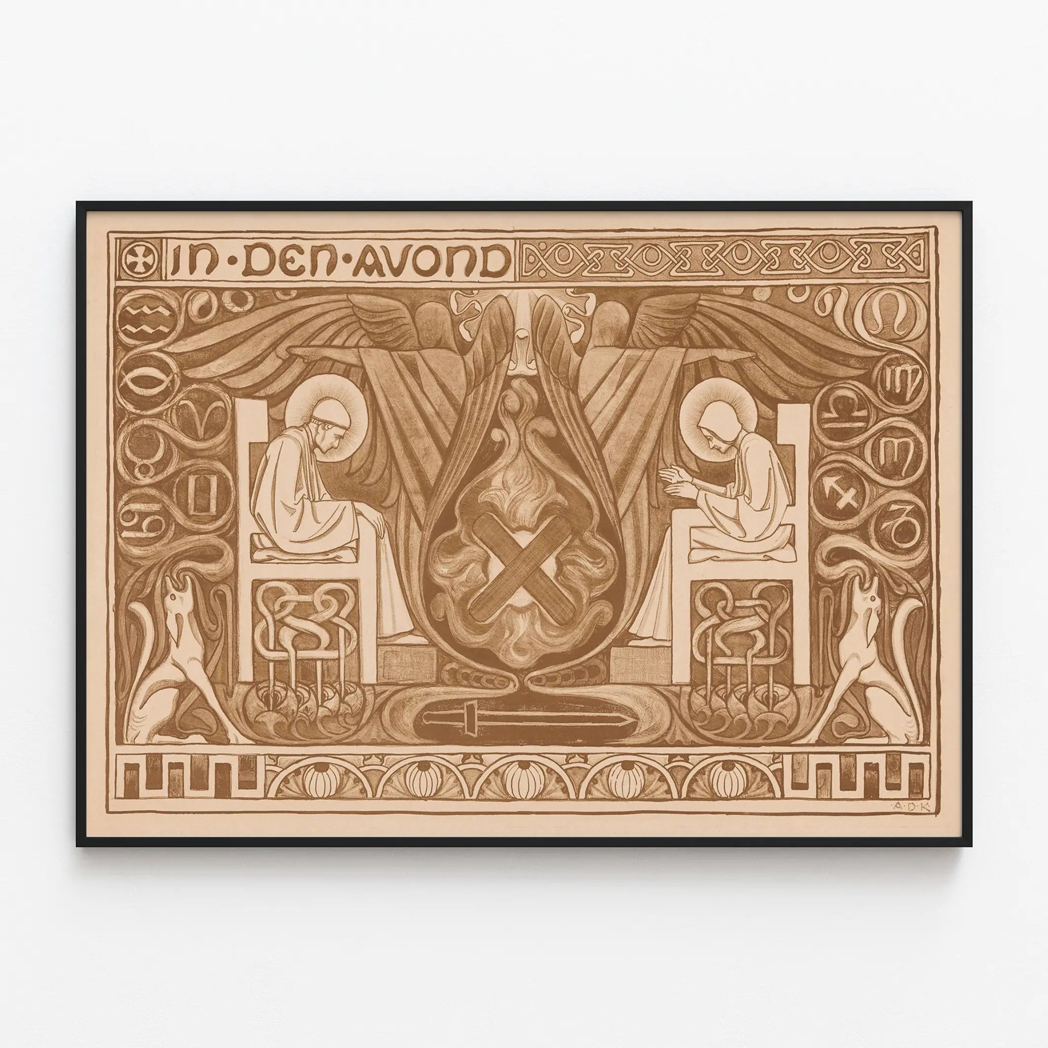 Dieses dekorative Plakat mit dem Titel „In Den Abend“ taucht ein in eine grafische Welt, die vom mittelalterlichen oder Jugendstil inspiriert ist, gekennzeichnet durch sorgfältig gezeichnete Linien und eine monochrome Sepia-Palette. Es zeigt zwei sitzende Figuren im Gebet, geschmückt mit leuchtenden Heiligenscheinen, und strahlt eine feierliche und mystische Atmosphäre aus. Umrahmt von komplexen geometrischen Mustern und kreisförmigen Symbolen, die an astrologische Zeichen erinnern, werden die Figuren von zwei geflügelten Silhouetten begleitet, die im Zentrum der Komposition emporsteigen. Das stilisierte Feuer in der Mitte sowie das Schwert, das am unteren Rand des Bildes liegt, verstärken den symbolischen und spirituellen Charakter dieser Wanddekoration. Der reich verzierte Rand mit Verschlingungen und Tierfiguren erinnert an alte Buchmalereien und verleiht diesem Plakat eine starke historische und künstlerische Dimension. Dieses Poster passt perfekt in ein Interieur, das nach einem Hauch von Authentizität und einem Rückblick in die Vergangenheit sucht, sei es im Wohnzimmer, in einer Bibliothek oder in einem Meditationsraum. Sein einzigartiger grafischer Stil macht es zu einer eleganten und bedeutungsvollen Wanddekoration, ideal für Liebhaber alter Kunst und Symbolik. Dieses Plakat ist eine ausgezeichnete Wahl, um eine beruhigende und kontemplative Atmosphäre zu schaffen und gleichzeitig die Wände mit einem charmanten und tiefgründigen Kunstwerk zu verschönern.