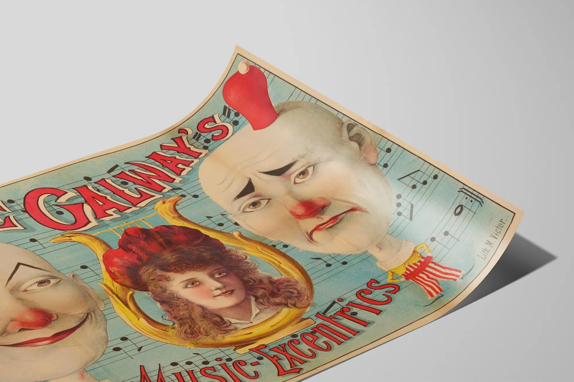 Entdecken Sie dieses einzigartige Vintage-Poster mit dem Titel „The Galway's Music Excentrics“, ein dekoratives Stück, das Ihrem Zuhause eine Prise Originalität und einen nostalgischen Charme verleiht. Dieses Plakat zeigt einen wunderbar exzentrischen Stil, mit zwei männlichen Figuren, deren Gesichter wie Clowns bemalt sind, gekrönt mit roten Mützen, die einen Frauenkopf umrahmen, der mit einem roten Hut gekrönt ist, alles vor einem blauen Hintergrund, verziert mit Musiknoten. Die Zeichnung wird durch rot gefärbte, stilisierte Schriftzüge ergänzt, die den künstlerischen und alten Charakter dieses Posters unterstreichen. Ideal für eine mutige Wanddekoration passt dieses Vintage-Poster perfekt in ein Wohnzimmer, einen Freizeitraum, einen Musikraum oder sogar ein Büro – für Liebhaber retro- und ausgefallener Atmosphären. Der Kontrast zwischen den karikaturhaften Gesichtern und der Zartheit des zentralen Frauenbildes schafft eine fesselnde visuelle Balance, die den Blick auf sich ziehen und Neugier wecken wird. Sein Stil erinnert an das Universum des Zirkus oder vergangener Musikveranstaltungen, verbindet Humor mit Melancholie und ist somit eine originelle Wahl für alle, die gerne mit Gegenständen dekorieren, die eine nostalgische und künstlerische Atmosphäre ausstrahlen. Diese Wanddekoration beschränkt sich nicht nur auf ein einfaches Poster, sondern wird zum echten Blickfang in einem Raum, der die Fantasie und Entdeckung anregt. Ob Sie Sammler von Kunstobjekten sind oder einfach nach einem außergewöhnlichen Dekoelement suchen – dieses Poster ist eine ideale Wahl. Es wird jede Wand mit seinen warmen Farben und seinem Vintage-Design aufwerten und gleichzeitig eine musikalische und theatralische Note in Ihre Umgebung bringen. Eine perfekte Entscheidung, um Ihr Zuhause mit einem Hauch von Exzentrik und Eleganz zu bereichern.