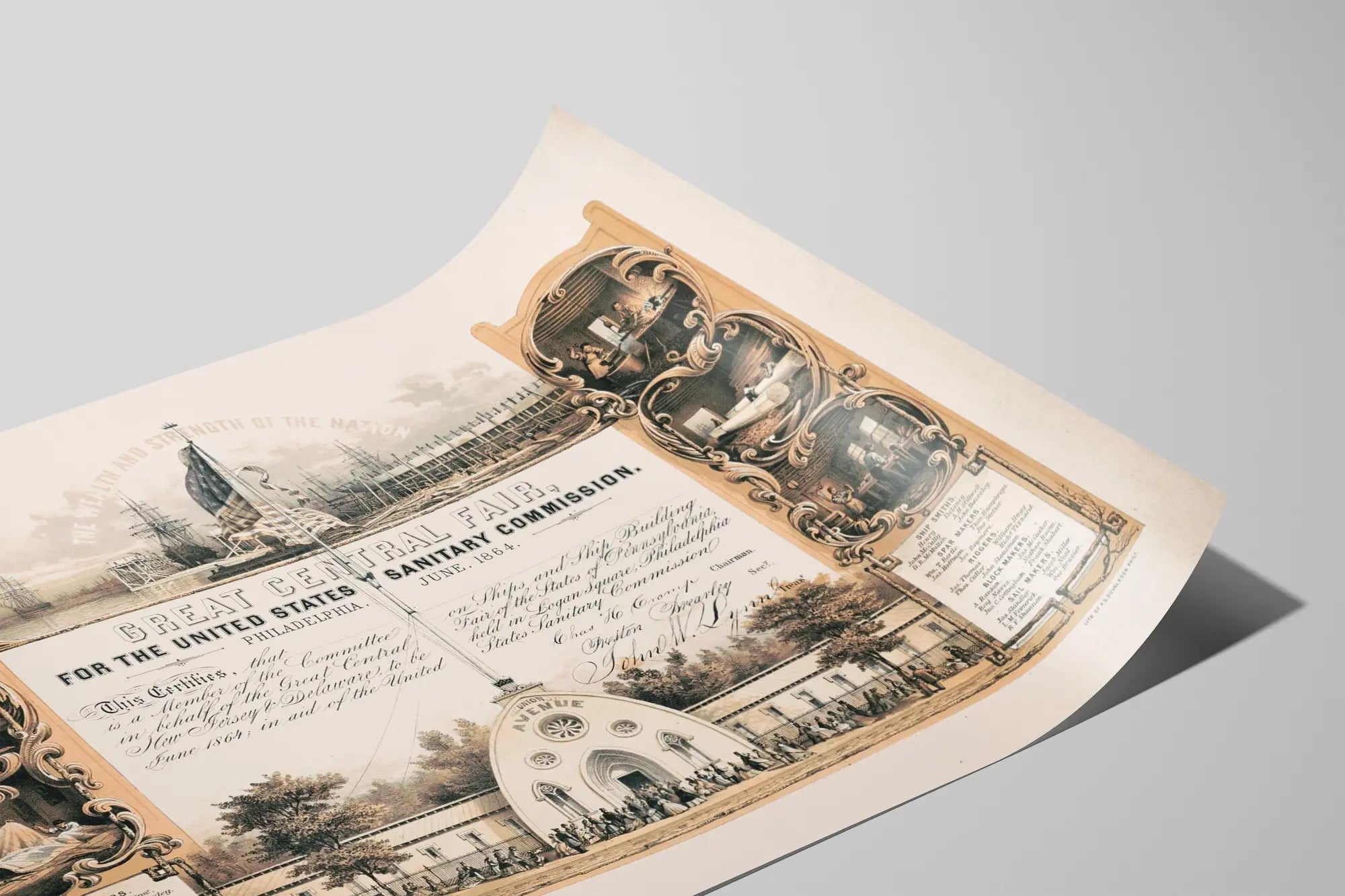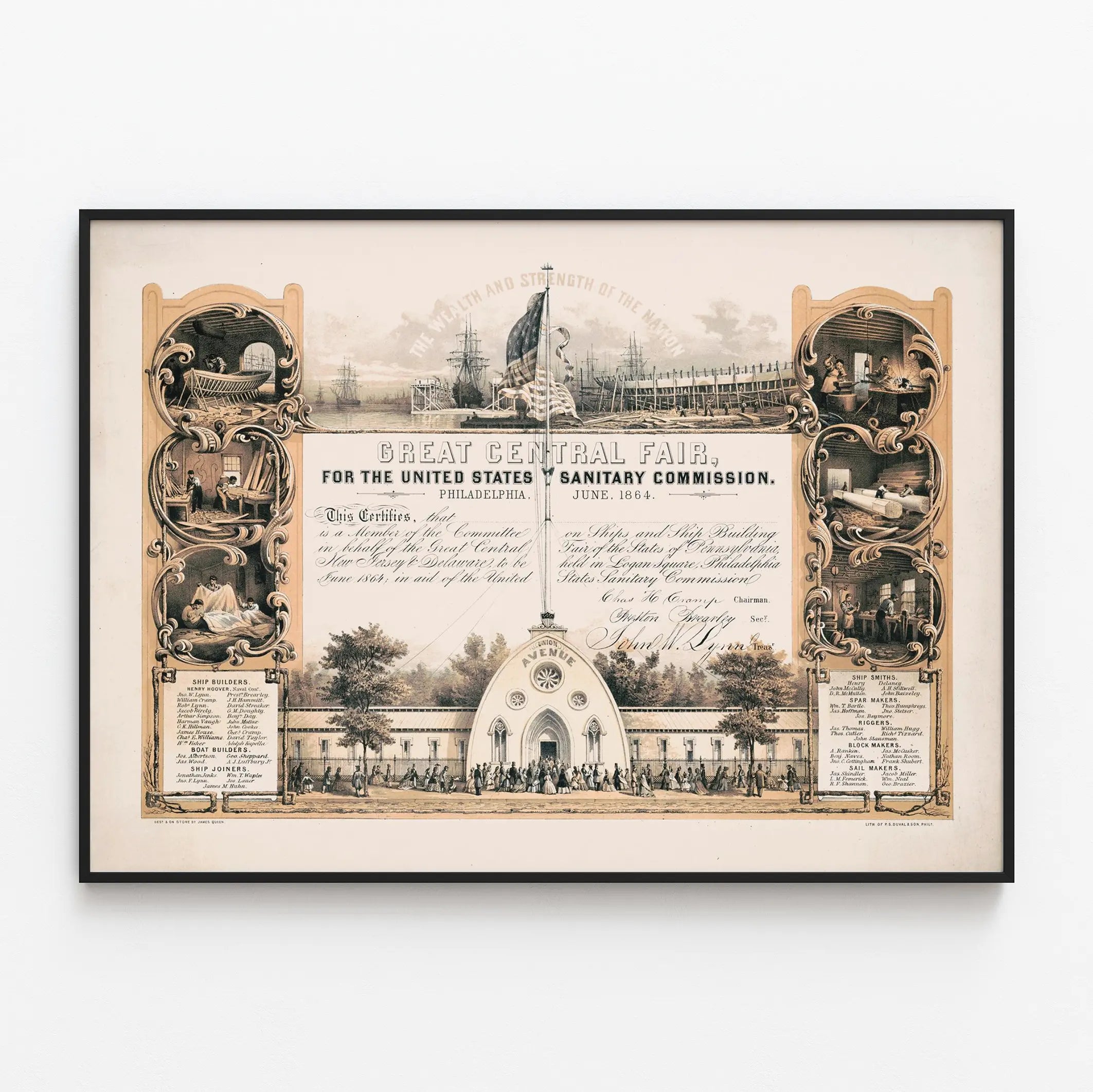Apportez une touche historique unique à votre décoration murale avec cette affiche vintage représentant la Great Central Fair, organisée en juin 1864 à Philadelphie pour la United States Sanitary Commission. Ce poster tonalité sépia met en avant une scène centrale illustrant le bâtiment principal de la foire, intitulé « AVENUE », où une foule se rassemble dans un cadre verdoyant et paisible, parfait pour une ambiance authentique et rétro. Ce tableau mural est encadré par deux colonnes latérales ornées de vignettes complexes détaillant les artisans et métiers impliqués dans la construction navale et la fabrication de bateaux à cette époque, notamment des charpentiers, forgerons, fabricant de barres et maîtres d'œuvre, ce qui témoigne du savoir-faire artisanal américain du 19ème siècle. Ces scènes discrètes mais riches en détails capturent la vie ouvrière et industrielle, offrant un contraste intéressant avec l'événement festif central. L’affiche se distingue par son titre en caractères typographiques solides au centre, entouré de mentions manuscrites stylisées qui certifient la participation de comités dans les États de Pennsylvanie, New Jersey et Delaware, soulignant l’aspect collectif et patriotique de cette foire dédiée à la commission sanitaire qui soutenait les efforts médicaux durant la guerre. Cette décoration murale est idéale pour les passionnés d’histoire américaine, d’événements patriotiques, ou pour ceux qui recherchent une pièce vintage imprimée qui allie art typographique et iconographie industrielle. Elle peut être encadrée seule ou accompagnée d’affiches similaires pour créer un mur à thématique historique dans votre salon, bureau ou espace culturel. Ce poster affiche un haut niveau de détails dans les gravures et dessins à la pierre lithographique, conférant un charme ancien et une esthétique élégante qui valoriseront tout intérieur à la recherche d’une décoration murale à la fois authentique et pleine d’histoire. En résumé, cette affiche Great Central Fair est un choix parfait pour enrichir un espace avec une œuvre qui raconte une page mémorable de l’histoire sociale et industrielle des États-Unis au 19ème siècle.