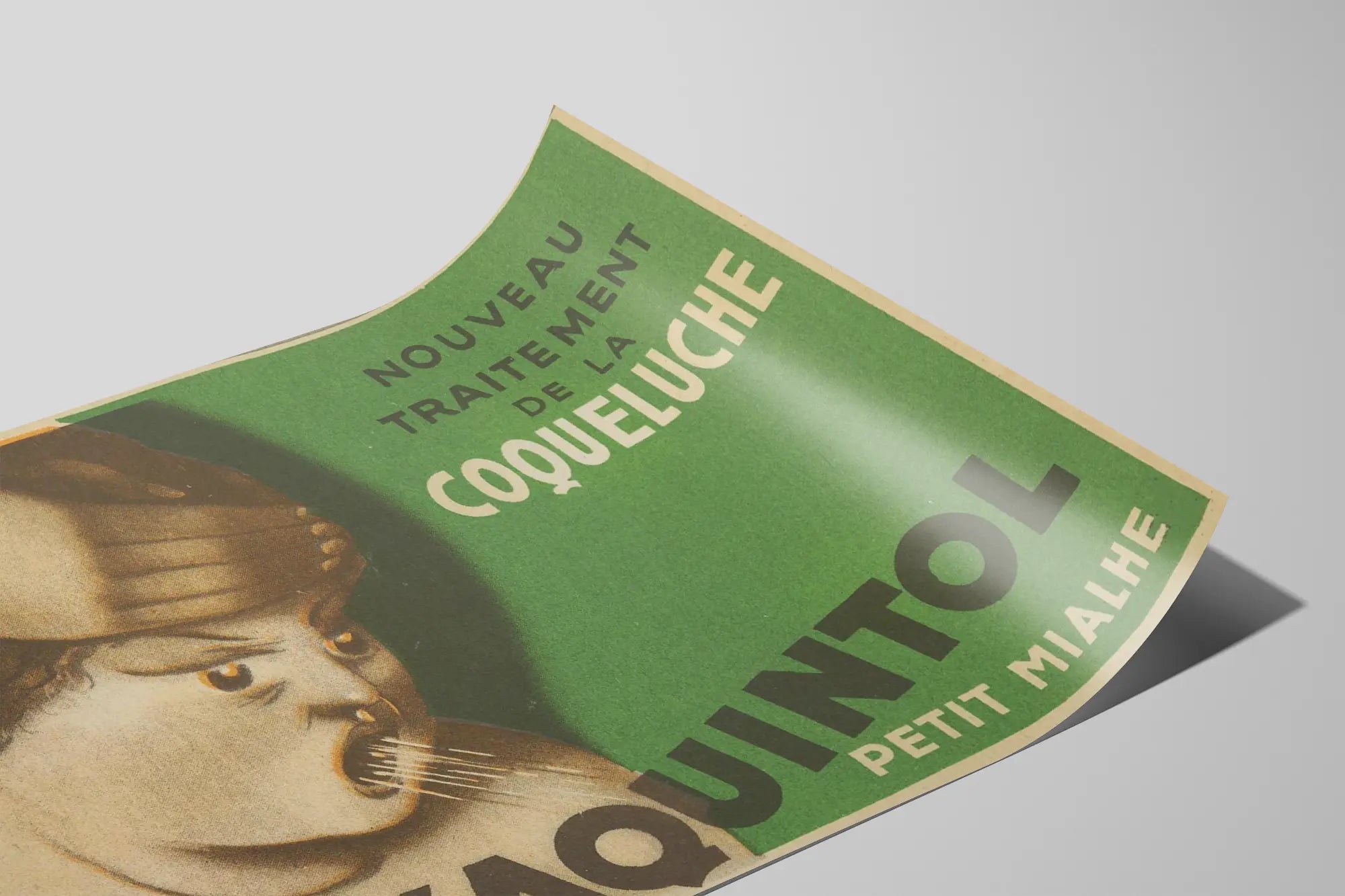 Cette affiche vintage publicitaire met en avant un traitement appelé "L’Aquintol" contre la coqueluche, créé par Petit Mialhe. Dans un style graphique ancien caractéristique, l’image montre une représentation expressive d’une personne en train de tousser ou d’expectorer, accentuant l’effet dramatique lié à la maladie ciblée. Le fond vert uni met en valeur les textes en noir et blanc, proposant un contraste puissant et une bonne lisibilité. Le design utilise une typographie bold et variée, renforçant l’impact visuel et l’efficacité du message. Cette affiche est un bel exemple de décoration murale rétro qui apportera une touche d’authenticité et d’histoire médicale à un intérieur. Que ce soit dans un salon, un bureau ou une salle d’attente, cet élément déco s’impose comme un objet de curiosité et de style. Idéale en poster encadré, elle s’inscrit aussi parfaitement dans une collection d’affiches anciennes ou de pièces publicitaires d’époque. Avec son graphisme marqué et ses couleurs sobres, elle mêle à la fois charme vintage et force communicative, tout en illustrant un sujet médical ancien d’intérêt historique. Ce tableau mural offre ainsi un équilibre entre esthétique singulière et contenu évocateur, donnant vie à un pan du passé dans votre espace contemporain.