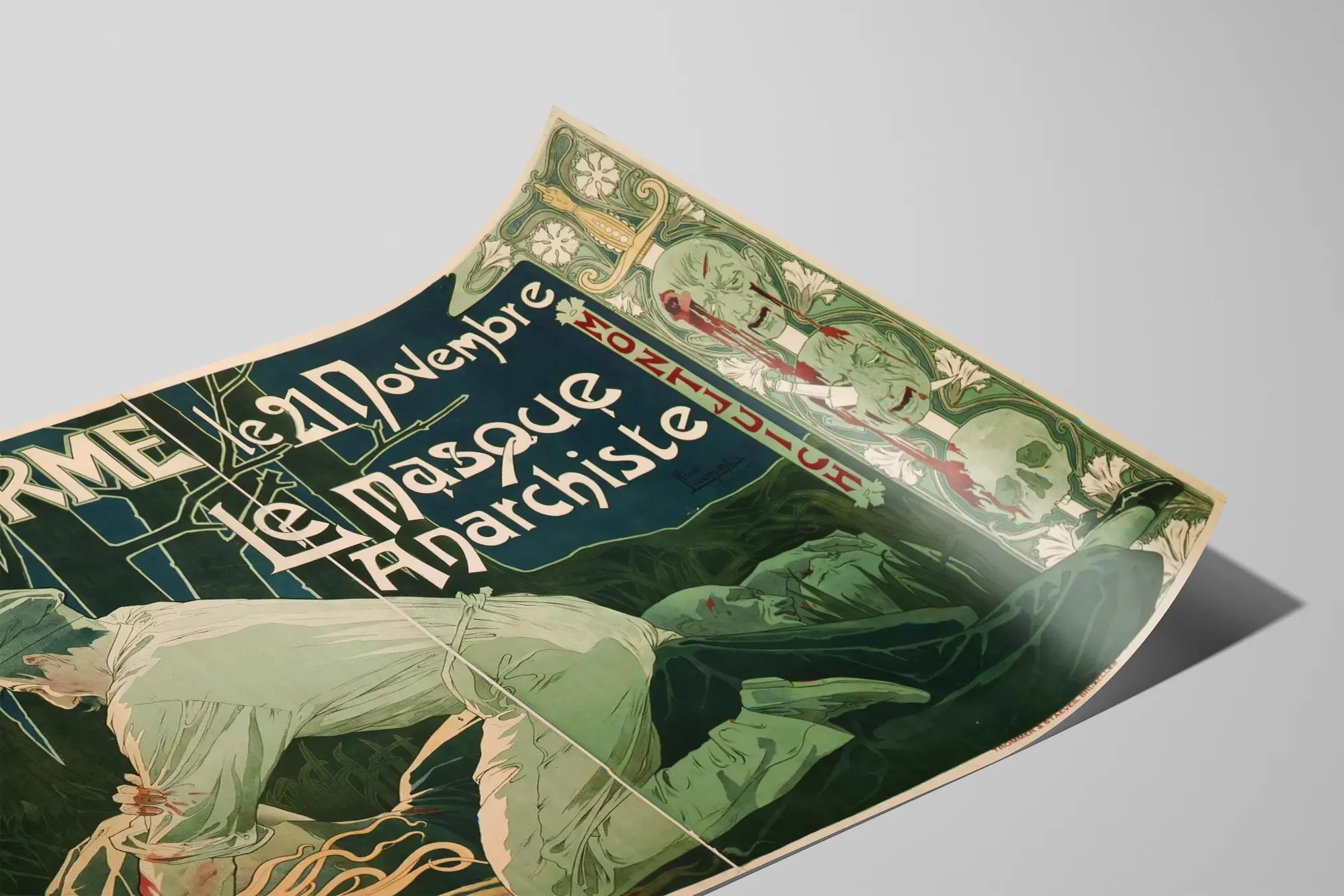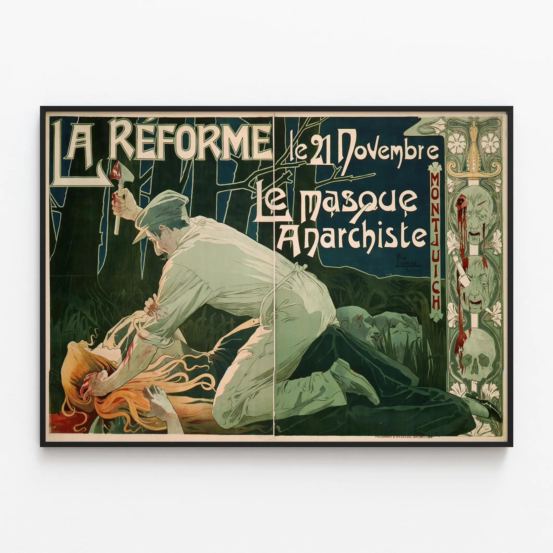 Découvrez cette affiche vintage impactante intitulée « La Réforme - Le 21 Novembre, Le Masque Anarchiste », une œuvre qui attire par son style graphique marqué et son ambiance dramatique. Ce poster de décoration murale représente une scène intense avec un homme tenant une hache, penché sur une femme au cheveu roux et un autre homme allongé, dans une atmosphère sombre et oppressante, évoquant un moment de conflit ou de rébellion. L'ensemble est encadré par un motif décoratif inspiré de l'Art Nouveau, soulignant la finesse du style artistique de cette illustration. Cette pièce originale au style vintage est parfaite pour les amateurs de décoration murale à la recherche d'affiches à forte personnalité. Son graphisme expressif et ses couleurs contrastées en font un élément marquant pour habiller un intérieur, qu'il soit moderne ou classique, apportant une touche historique et dramatique à votre mur. Ce poster, par sa composition dramatique et l’intensité de ses traits, s'impose comme un tableau narratif, capable de susciter la curiosité et la réflexion chez ceux qui le contemplent. L'affiche s'adresse aussi bien aux collectionneurs passionnés de l'histoire graphique et politique qu’aux décorateurs désireux d’introduire une forte empreinte visuelle dans une pièce. Elle évoque un épisode ou un thème social, politique ou anarchiste sans fournir de détails explicites, laissant ainsi place à l’interprétation et à la discussion autour des symboles visuels présents, notamment le masque et le titre suggestif. Pour une décoration murale originale et pleine de caractère, cette affiche vintage traduit une époque où l'affiche jouait un rôle fort de communication visuelle. Facile à encadrer et à exposer, elle peut se placer dans un salon, un bureau ou un espace culturel, attirant le regard tout en racontant une histoire à travers ses couleurs et son dessin dynamique. Elle constitue un choix décoratif audacieux qui mêle art et message, idéal pour personnaliser votre intérieur avec une pièce chargée d’émotion et de mystère.