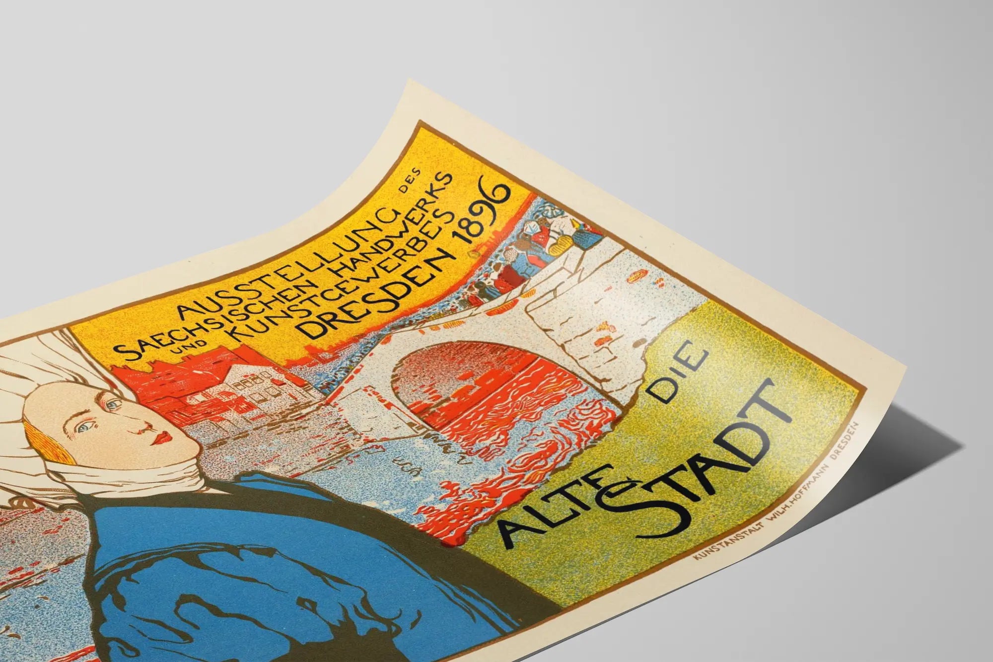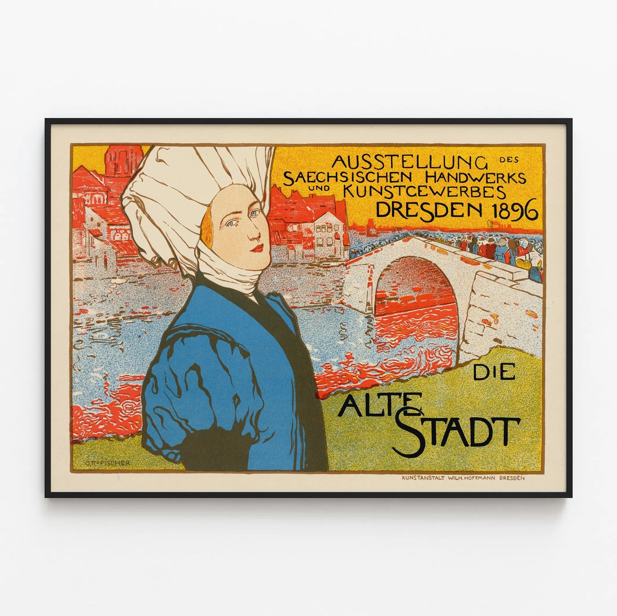 Cette affiche vintage intitulée "La Vieille Ville" capture avec charme l'esprit d'une exposition artisanale et artistique tenue à Dresde en 1896. La composition graphique met en scène une scène pittoresque où une femme en costume traditionnel attire le regard, devant un fond illustrant un pont ancien et des bâtiments historiques au bord d'une rivière. L'utilisation de couleurs vives et contrastées — jaune, rouge, bleu et vert — dynamise cette décoration murale, qui mêle art et tradition. Ce poster est une reproduction d'une affiche publicitaire pour une exposition des métiers d'art saxons et des arts appliqués, organisée à Dresde à la fin du XIXe siècle. Le style graphique rappelle les influences de l'époque, notamment l'Art Nouveau, avec ses lignes épurées et ses aplats colorés, ce qui en fait un élément décoratif distinct et élégant pour les intérieurs contemporains et classiques. Parfaite pour les amateurs d'histoire, de design rétro et de décorations murales riches en symbolique, cette affiche apporte une touche authentique à n'importe quelle pièce. Elle évoque le charme d'une vieille ville européenne vue à travers le prisme de l'art et du patrimoine, parfait pour enrichir un mur de salon, bureau ou boutique avec une ambiance vintage et culturelle. En accrochant ce tableau mural, vous offrez à votre décor un voyage dans le temps, dans une ambiance élégante et pleine d'histoire. Cette affiche poster fonctionne aussi comme un élément narratif, racontant une époque révolue mais encore pleine de vie. Idéale pour insuffler caractère et originalité, elle s'adapte à divers styles d'intérieur et attire l'œil par sa composition bien pensée et ses détails soignés. Cette décoration murale vintage est une invitation à redécouvrir le savoir-faire d'autrefois et la beauté des villes historiques, tout en apportant une touche artistique unique à votre espace. Son graphisme expressif et coloré fera de cette affiche un point focal remarquable dans votre décoration intérieure.