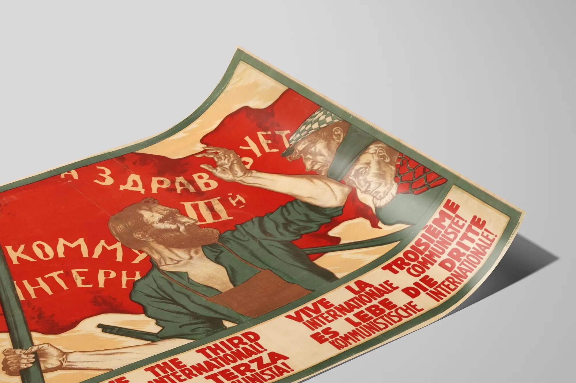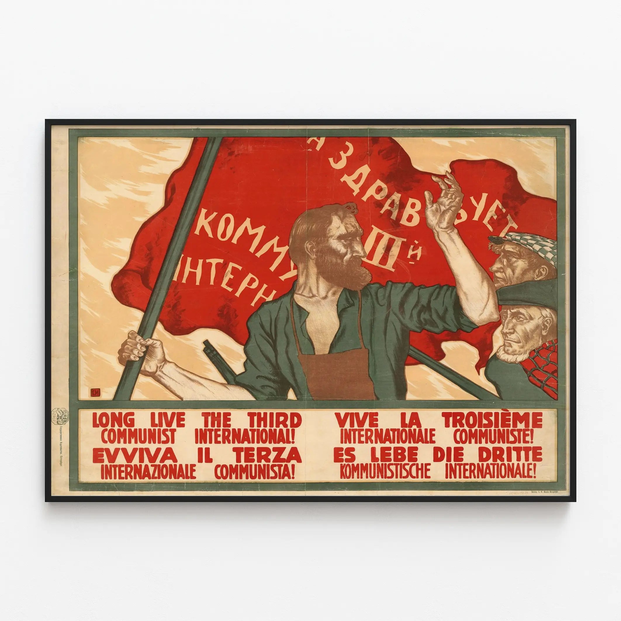 Cette affiche vintage célèbre la Troisième Internationale communiste avec un style graphique fort et évocateur. Présentant une scène dynamique, l'image met en avant un homme barbu tenant fièrement un drapeau rouge orné de caractères cyrilliques. À ses côtés, deux autres hommes l'observent avec attention, incarnant l'engagement collectif. Le drapeau rouge, symbole puissant du communisme, occupe une place centrale et dynamique, accentuant le message politique de l'œuvre.