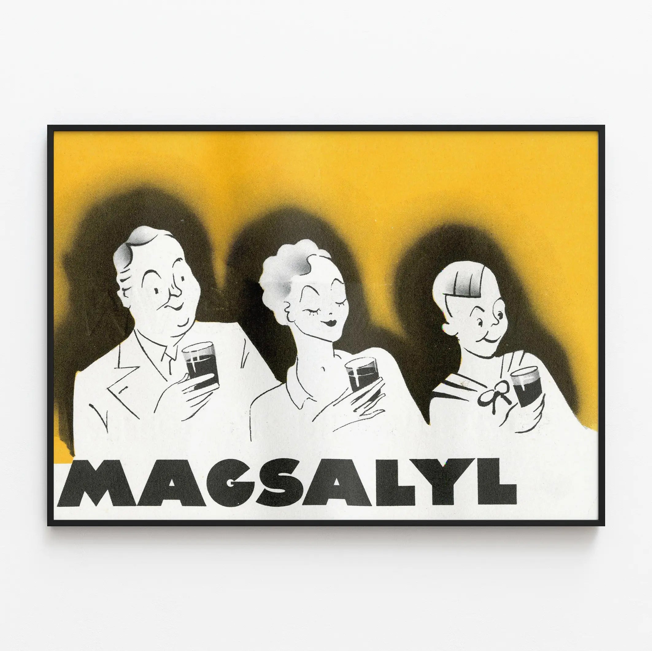 Dieses Vintage-Poster MAGSALYL ist ein perfektes Beispiel für retro Wanddekoration und verleiht Ihrem Zuhause eine nostalgische und warme Note. Es zeigt drei lachende Figuren, die jeweils ein Glas in der Hand halten, diese schwarz-weiße Illustration hebt sich vor einem leuchtend gelben Hintergrund ab und schafft einen beeindruckenden visuellen Kontrast, der das Auge natürlich anzieht. Der grafische Stil erinnert an die Werbeplakate der Mitte des 20. Jahrhunderts, mit einer einfachen, aber ausdrucksstarken Zeichnung und einer effektiven Komposition, typisch für die Werbekampagnen dieser Zeit.
