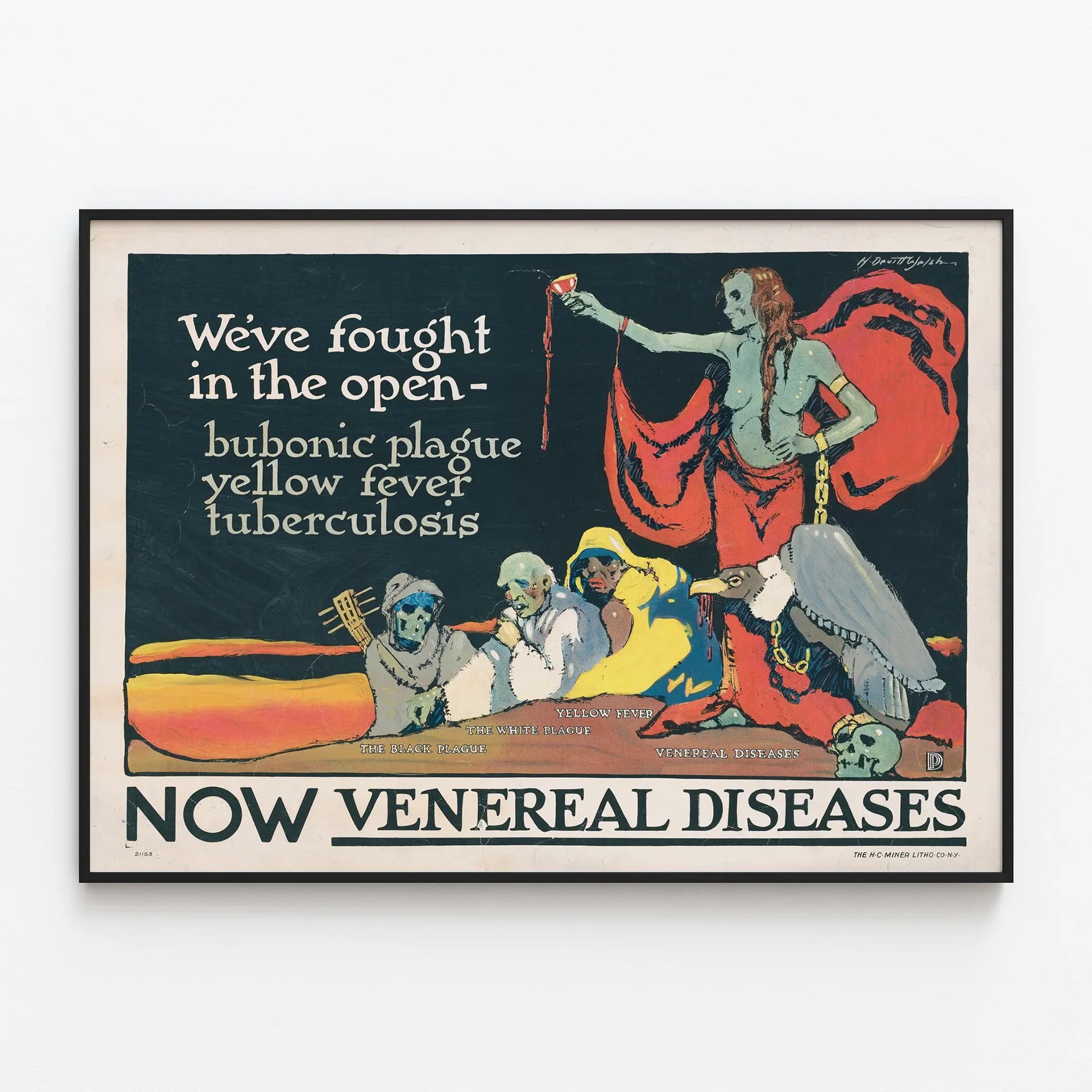 Cette affiche vintage de style peinture murale illustre la lutte contre plusieurs maladies contagieuses, un thème fort en décoration murale chargée d'histoire. On y voit des personnages personnifiant des maladies telles que la peste bubonique, la fièvre jaune, la tuberculose et enfin les maladies vénériennes qui sont mises en avant comme la dernière bataille à mener. Composée dans des tons frappants dominés par le noir, le rouge et le jaune, cette affiche murale attire l'œil grâce à ses contrastes et à ses figures expressives. Le poster, avec son texte en caractères clairs sur fond sombre, évoque une ambiance dramatique et éducative, parfaite pour une décoration murale originale qui interpelle. Ce tableau mural apporte une touche historique et un message puissant sur la santé publique, idéal pour une collection d'affiches artistiques ou un intérieur qui valorise les œuvres à contenu social. Sa composition graphique marquée par la présence d'une figure féminine centrale et d'autres silhouettes symboliques enrichit cet objet décoratif mural d'un sens profond. Conçu à partir d’une lithographie, ce poster vintage est un bel exemple d'utilisation de l'art dans la communication et la prévention. Un choix déco idéal pour les amateurs de posters historiques ou les passionnés de design mural engagé.