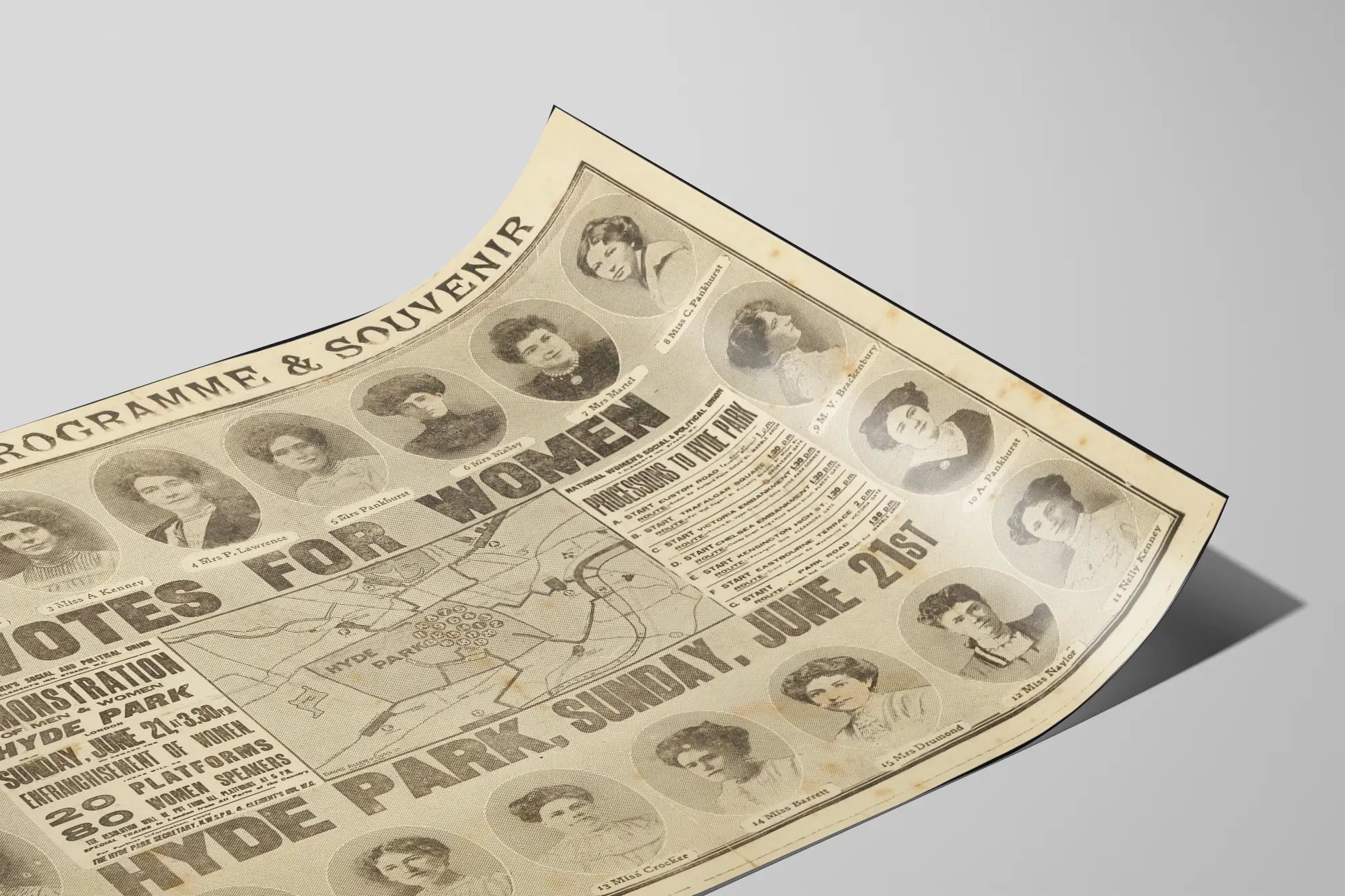 Cette affiche vintage est un souvenir officiel du programme de la marche des femmes pour le droit de vote, qui s'est tenue le dimanche 21 juin 1908 à Hyde Park, Londres. Ce poster de décoration murale historique présente les portraits de plusieurs militantes féminines engagées dans la lutte pour l'obtention du droit de vote, entourant un plan détaillé des différentes processions menant à Hyde Park. Au centre, un texte fort "Votes for Women" affirme le message principal de cet événement emblématique. Cette affiche se distingue par son style typographique ancien et sa composition organisée, parfaite pour les amateurs d'histoire féminine et d'art graphique vintage. Ce tableau mural s'intègre idéalement dans une décoration murale à thème historique ou activiste, apportant une touche authentique et inspirante à tout intérieur. Imprimée sur un papier à effet ancien, elle rappelle une époque cruciale du combat pour l'égalité des droits. Ce poster est une pièce de décoration murale unique, parfaite pour enrichir un espace d'expression culturelle ou un bureau. Son design captivant met en avant l'importance des mouvements sociaux et politiques féminins du début du XXe siècle, tout en offrant une valeur décorative esthétique remarquable.