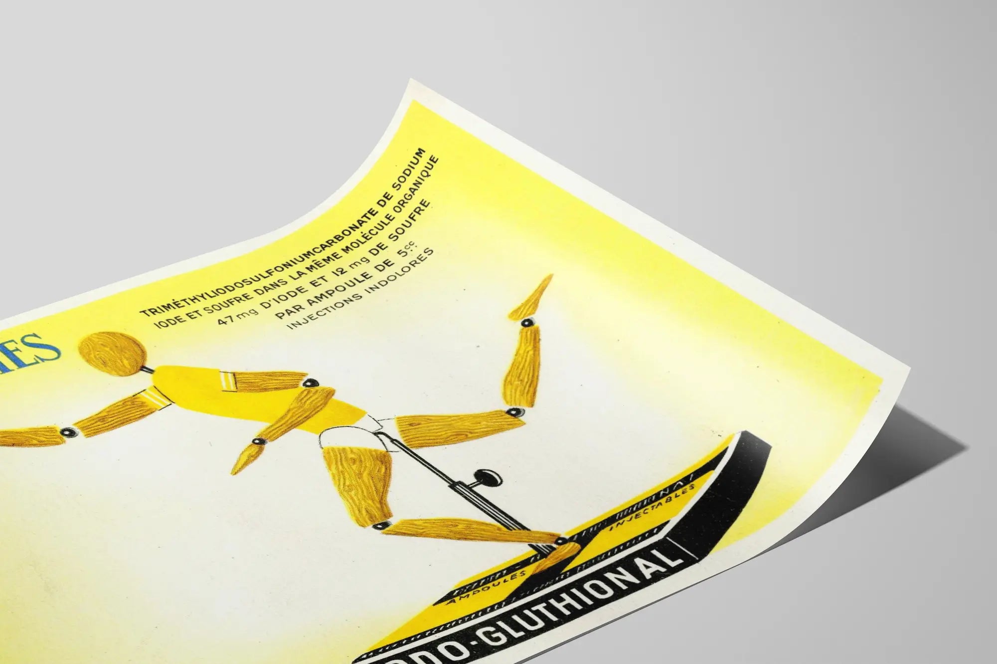 Cette affiche vintage présente une illustration stylisée d'une figurine articulée en bois exécutant une pose dynamique, symbolisant la mobilité et le mouvement. Le personnage, vêtu d'un simple maillot jaune, évoque la souplesse et la fluidité des articulations, un contraste artistique avec le thème des rhumatismes. Le fond jaune lumineux apporte une touche rétro et chaleureuse à la décoration murale, idéale pour un espace dédié à la santé, au bien-être ou à la médecine. Le texte scientifique inscrit sur l'image fait référence au Triméthyliodosulfonium carbonate de sodium, un composé organique contenant du iode et du soufre, utilisé pour traiter les rhumatismes. La composition précise indique 47 mg d'iode et 12 mg de soufre par ampoule de 5 cc, soulignant les aspects médicaux et pharmaceutiques sous-jacents. Ce type d'affiche publicitaire ancienne s'adresse à un public intéressé par la décoration murale originale avec une touche d'histoire médicale. Comme poster, cette affiche vintage est parfaite pour apporter une ambiance unique et authentique à un cabinet médical, une pharmacie ou même une salle de séjour. Son design graphique épuré, combinant texte et image, en fait un objet décoratif élégant et informatif. Ce tableau mural est une invitation à la réflexion sur les avancées de la médecine et sur les traitements des affections articulaires, tout en restant un élément esthétique. Cette pièce de décoration murale mêle art et science, donnant un style rétro chic et instructif à votre intérieur. Grâce à ses couleurs basiques mais efficaces, notamment le jaune et le noir, elle s'intègre facilement dans différents types d'aménagement. Que vous soyez amateur d'imprimés vintage ou passionné par les affiches médicales, ce poster sera un choix remarquable. En résumé, ce tableau mural rhumatismes iodo-gluthional est une affiche à la fois décorative et porteuse d'un message scientifique, parfaite pour enrichir votre décoration murale avec authenticité et originalité.