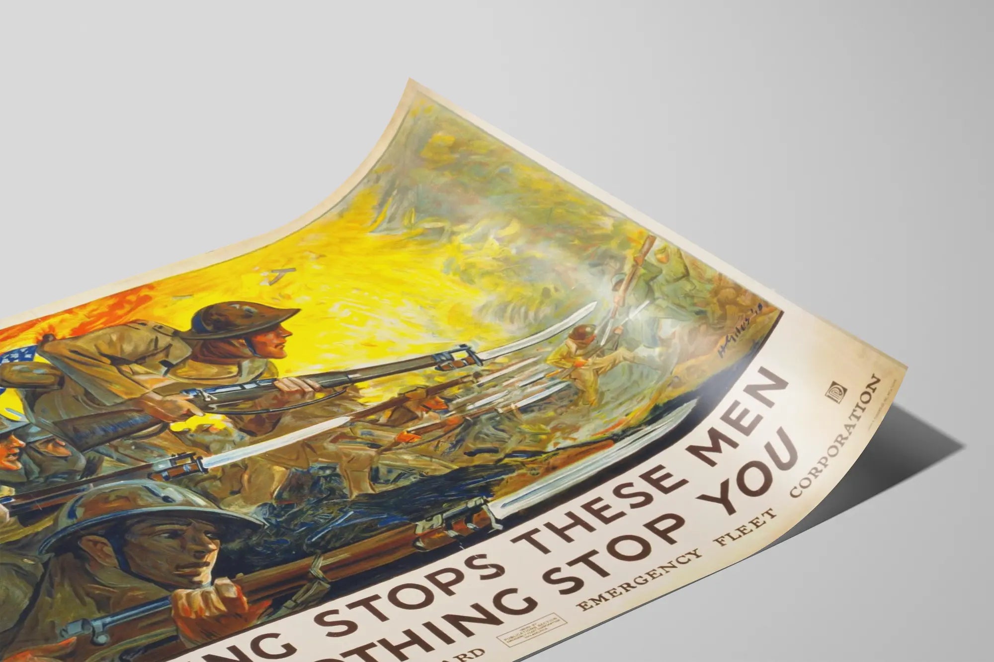 Cette affiche vintage de style militaire américain présente une scène dynamique et intense de soldats en pleine charge, baïonnette en avant, dans une ambiance de combat. Les couleurs chaudes et contrastées dominent, avec un ciel éclairé par une explosion ou un feu intense, symbolisant la bravoure et la détermination sans faille des hommes au front. On distingue un drapeau américain flottant à l'arrière-plan, renforçant l'atmosphère patriotique et l'engagement national. Ce poster de décoration murale incarne la puissance et la résilience, parfait pour un intérieur qui cherche à évoquer la force, le courage et l'histoire militaire américaine. L'inscription en majuscules souligne le message : "Nothing stops these men, let nothing stop you," un appel à la persévérance et à la motivation. Ce tableau mural est idéal pour les amateurs d'histoire, les passionnés de décorations murales à thème vintage ou militaire, et ceux qui souhaitent apporter une touche authentique et inspirante à leur espace de vie ou de travail. Avec ses détails soignés et son rendu pictural, cette affiche se distingue par son esthétique classique, mêlant art et message puissant, et peut être mise en valeur dans tout type de décoration murale, que ce soit une galerie d'affiches, un bureau ou un salon.