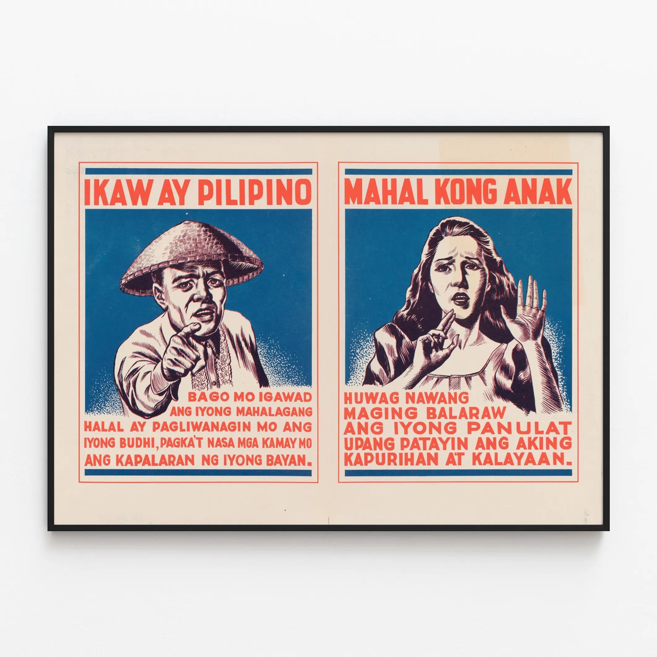 Cette affiche vintage philippine, divisée en deux parties distinctes, est une pièce marquante pour une décoration murale pleine de sens et d'histoire. À gauche, un homme en chapeau traditionnel pointe du doigt le spectateur, accompagné d'un texte en philippin qui évoque la responsabilité personnelle et l'importance de la conscience dans le destin de la nation. À droite, une femme exprime une émotion forte, renforcée par un message qui met en garde contre la trahison et souligne la valeur de l'honneur et de la liberté. Le choix des couleurs bleu, rouge et blanc, ainsi que le style graphique très typé, confèrent à cette affiche une authenticité qui séduira les amateurs d'art populaire et d'œuvres engagées. Cette décoration murale attire l'attention par son message puissant et universel, mais aussi par son esthétique rétro qui rappelle les affiches de propagande ou d'éducation civique du milieu du XXe siècle. En format poster, elle s'intègre parfaitement à un intérieur cherchant à combiner histoire, culture et design. Que ce soit pour un salon, un bureau ou un espace dédié à la mémoire historique, cette affiche offre une ambiance dynamique et propice à la réflexion. Idéale pour les passionnés d'affiches anciennes, de messages politiques ou d'art graphique avec un message clair et profond, cette décoration murale apportera une touche unique à vos murs. Ajouter cette pièce à votre collection, c'est inviter un fragment de patrimoine philippin riche en symbolique dans votre espace de vie.