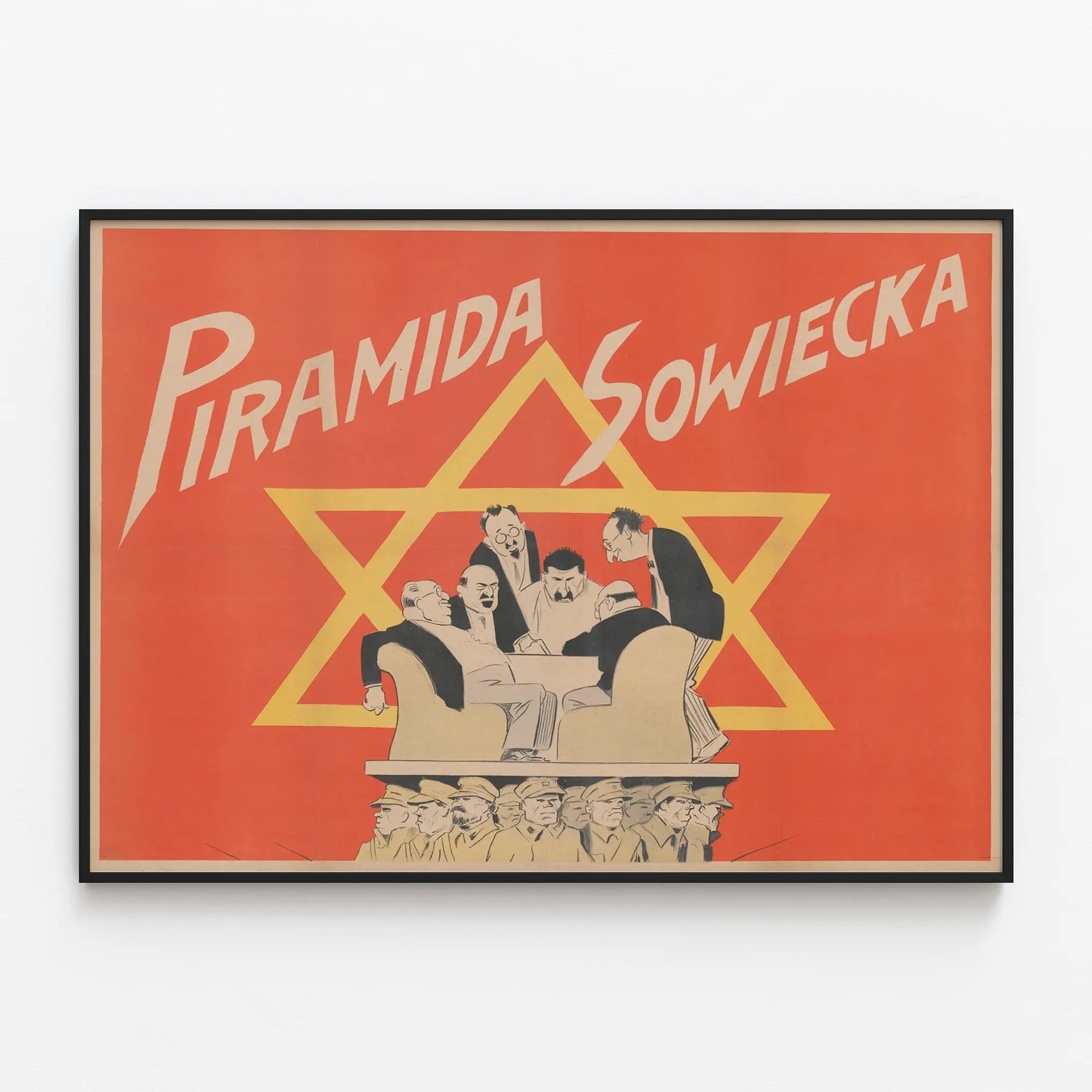 Dieses Vintage-Poster mit dem Titel "Piramida Sowiecka" ist ein einzigartiges Wanddekorationselement, ideal für Liebhaber grafischer Kunst und politischer Geschichte. Auf einem leuchtend roten Hintergrund zeigt es eine karikaturartige Zeichnung, die eine Gruppe von Männern um einen Tisch darstellt, die auf einem Sofa sitzen, mit einem großen gelben Stern im Hintergrund. Das Bild wird durch eine stilisierte Komposition lebendig, bei der die Figuren, in formelle Kleidung gekleidet, in eine Diskussion oder eine strategische Besprechung vertieft scheinen. Das Podest, auf dem die Szene ruht, wird von einer Reihe militärischer Figuren getragen, die eine Hierarchie oder eine Pyramide der Macht darstellen. Der Text "Piramida Sowiecka" erscheint in schrägen weißen Buchstaben im oberen Bereich, im dynamischen typografischen Stil, was die visuelle Wirkung des Posters verstärkt. Dieses Plakat ist eine ausgezeichnete Wahl, um eine Wanddekoration mit einem Hauch militärischer Geschichte und retro-ästhetischem Charme zu bereichern. Es passt sowohl in Arbeitsräume als auch in moderne Wohnzimmer, die eine originelle und bedeutungsvolle Wandgestaltung suchen. Die Farbpalette, dominiert von Rot-, Gelb- und Schwarztönen, bietet einen starken Kontrast und hebt den grafischen Stil sowie die eindrucksvolle Wirkung dieses Posters hervor. Dieses vintage Wandbild, durch sein Design und seinen Inhalt, lässt sich auch in thematische Sammlungen oder Ausstellungen zur politischen Propaganda integrieren. Es ist eine Wanddekoration mit altem Charme, die Ihrem Interieur Charakter und Originalität verleiht und gleichzeitig zum Nachdenken anregt. Verleihen Sie Ihren Wänden ein Poster voller Geschichte und visueller Energie mit diesem einzigartigen Stil.
