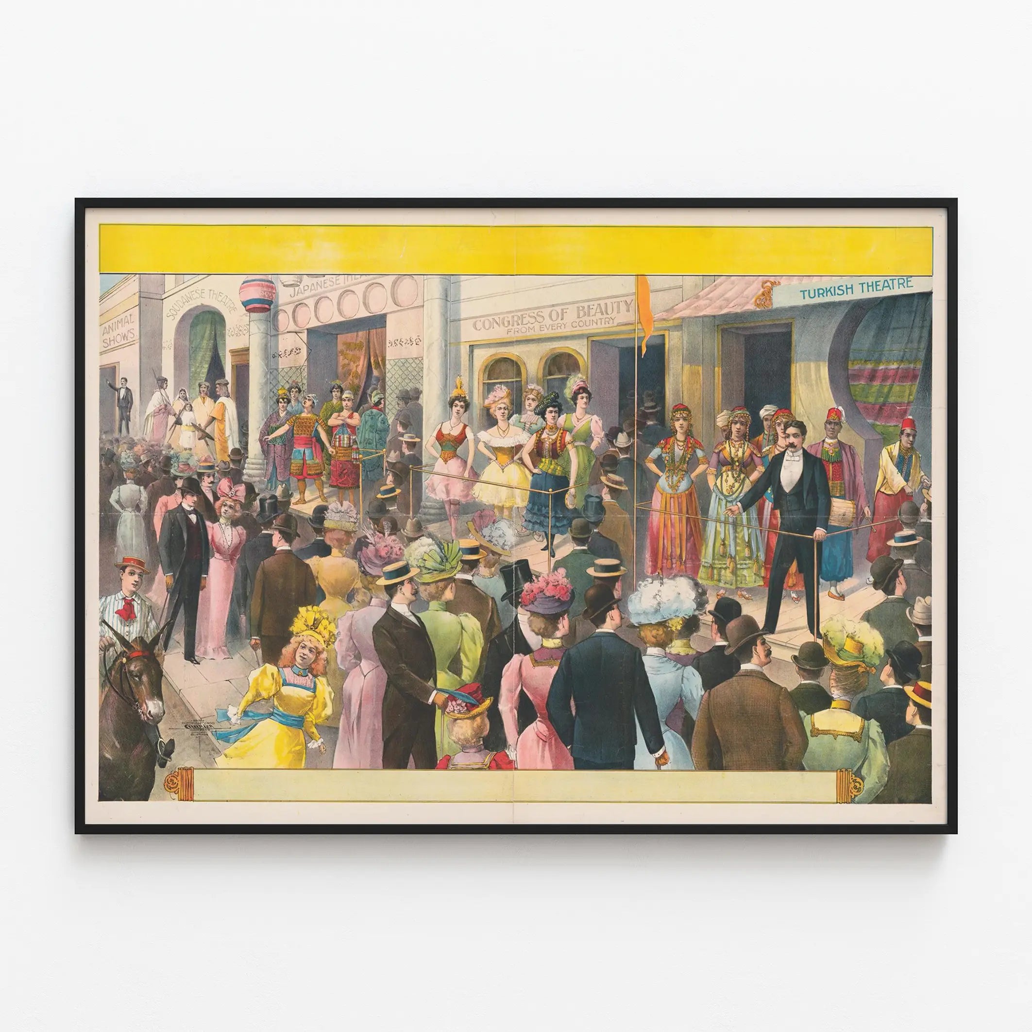 Dieses Vintage-Poster zeigt eine lebendige Szene eines Jahrmarktspektakels, bei dem eine elegant gekleidete Menschenmenge beobachtet, wie Teilnehmer in traditionellen Kostümen verschiedener Art auftreten. Mit sorgfältig ausgearbeiteten Details illustriert, zieht diese Wanddekoration das Auge durch die Vielfalt der Kostüme an und ruft eine kulturelle Vielfalt durch verschiedene ausländische Einflüsse hervor. Im Zentrum stehen mehrere Frauen in aufwändigen Kleidern und Männer in Anzügen auf der Bühne, die unterschiedliche Kulturen repräsentieren, hinter einem Geländer, unter Schildern wie „Congress of Beauty“ oder „Türkisches Theater“. Die beobachtende Menge, gekleidet im alten Stil mit Hüten und eleganter Kleidung, verstärkt die festliche und historische Atmosphäre dieses Kunstwerks. Dieses Dekorationsposter ist ideal, um einem Raum einen Hauch von Authentizität und nostalgischem Charme zu verleihen, insbesondere für Liebhaber von Vintage-Wanddekorationen und grafischen Elementen im Zusammenhang mit früheren Kulturveranstaltungen. Mit seinen sanften Farben und feinen Details erzählt dieses Plakat eine historische soziale Szene und verwandelt jeden Raum in ein visuelles Kuriositätenkabinett. Es passt perfekt in ein Wohnzimmer, Büro oder Wartezimmer und erinnert an eine faszinierende Vergangenheit, in der Schauspiel und Tradition sich vereinten, um die Zuschauer zu fesseln. Dieses Druckbild richtet sich sowohl an Geschichtsbegeisterte als auch an Sammler, die eine originelle und eindrucksvolle Wanddekoration suchen.