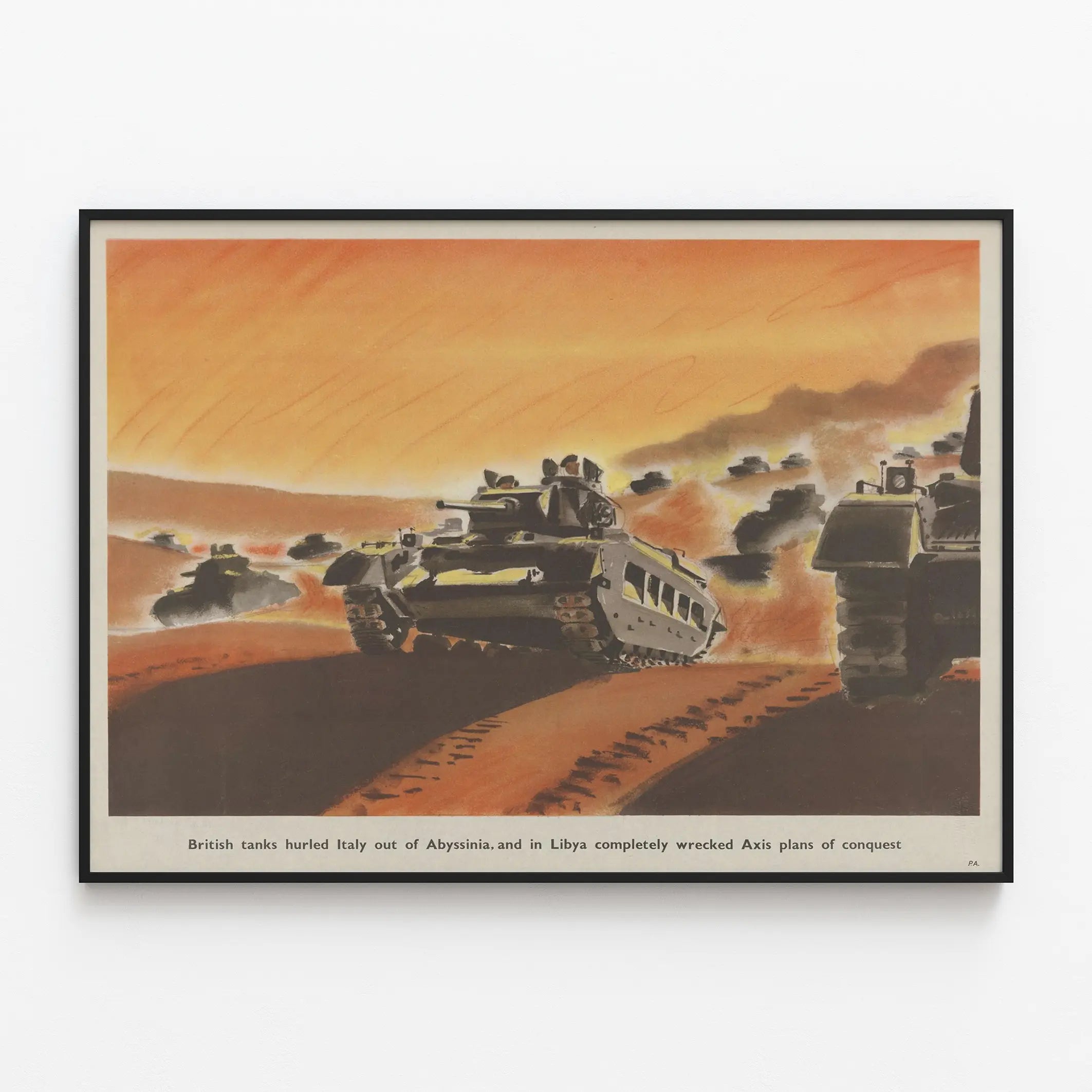 Dieses Vintage-Poster zeigt eine Szene britischer Panzer, die auf einem Wüstenboden unter einem orangefarbenen Himmel vorrücken, und stellt einen bedeutenden militärischen Moment dar. Dieses Wanddekoration-Poster fängt die Kraft und Dynamik der britischen Kampfpanzer während ihres Einsatzes in Afrika ein – ein kraftvolles Bild, um Ihr Zuhause zu bereichern. Die Komposition hebt mehrere bewegte gepanzerte Fahrzeuge hervor, mit sichtbaren Kettenspuren im Vordergrund, was die Tiefe und Realitätsnähe der Szene unterstreicht. Dieses historische Poster ist ideal als Wanddekoration für Liebhaber militärischer Geschichte, Sammler oder um einen Raum mit einem Vintage-Flair und einem Kriegsthema zu gestalten. Der verwendete künstlerische Stil nutzt warme Farbtöne und eine expressive Maltechnik, die die dramatische und energische Atmosphäre des Gemäldes betont. Dieses Wandposter passt perfekt in ein Wohnzimmer, Büro oder jeden Raum, der eine kraftvolle und eindrucksvolle Stimmung sucht. Es bietet ein schönes Beispiel für Wanddekoration im Retro-Stil und wird auch die Begeisterten für Plakate und Poster ansprechen, die sich mit dem Thema historischer Konflikte beschäftigen.