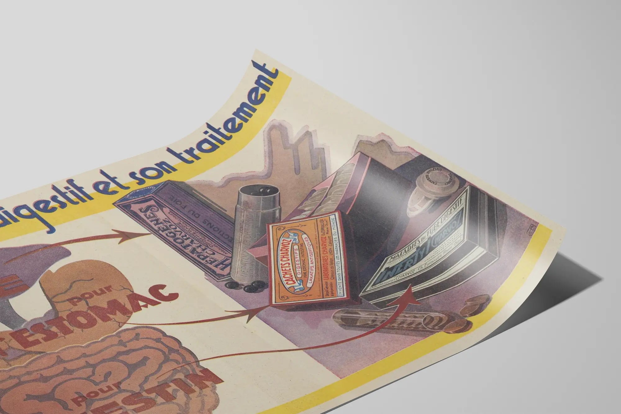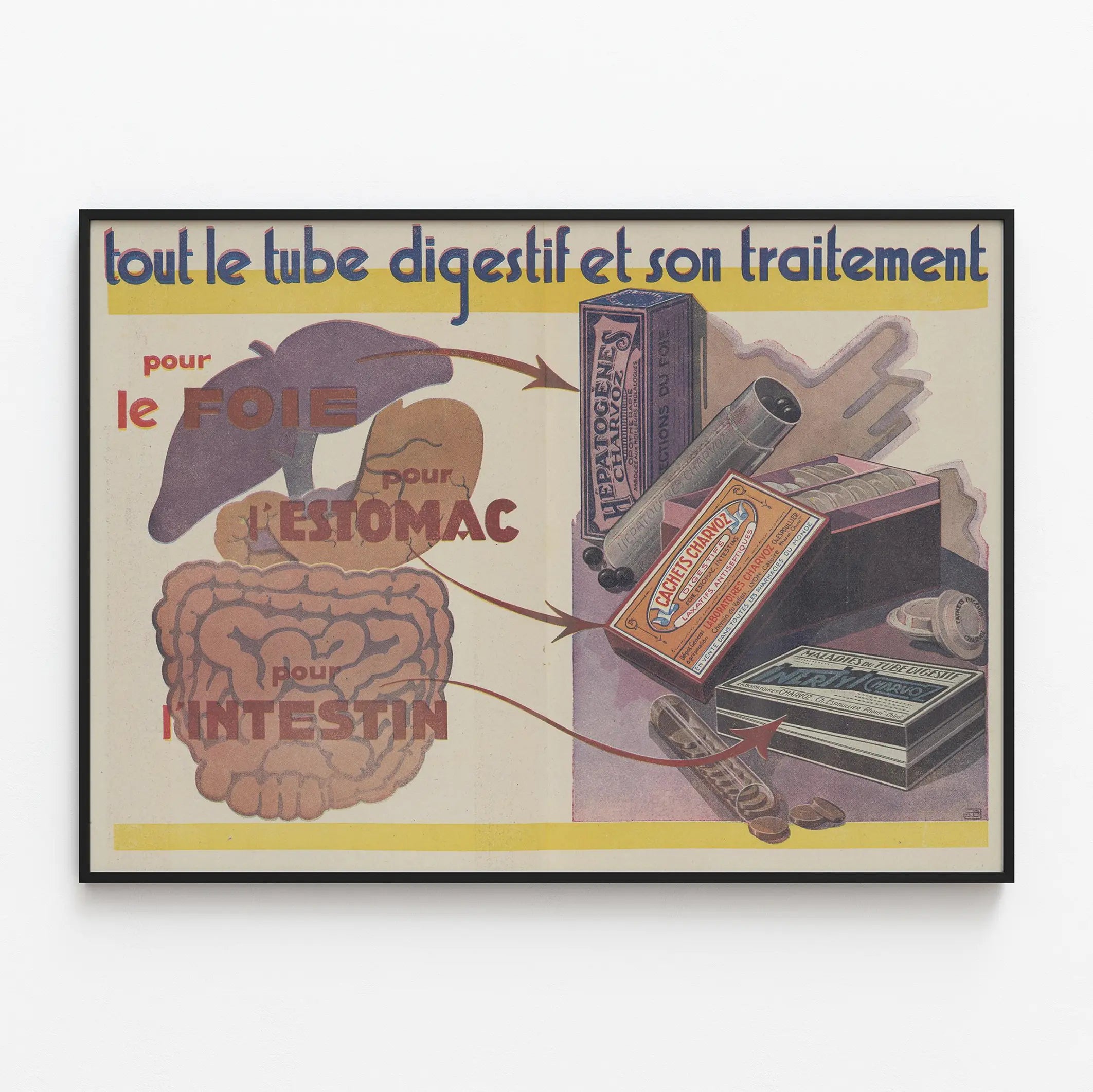 Dieses Vintage-Poster veranschaulicht pädagogisch die Behandlung der verschiedenen Teile des Verdauungstrakts anhand von drei spezifischen Medikamenten. Es hebt die Leber, den Magen und den Darm hervor, mit Pfeilen, die die jeweils passenden Medikamente anzeigen. Auf der rechten Seite des Posters entdeckt man alte Arzneimittelpackungen und -schachteln, darunter eine Schachtel mit der Aufschrift „HEPA-TOGENE "CHARVOZ"“, die für Lebererkrankungen bestimmt ist, Tabletten für den Magen namens „CHARVOZ-Tabletten“ und eine Mappe, die auf Erkrankungen des Verdauungstrakts verweist. Dieses Retro-Poster kombiniert vereinfachte anatomische Illustrationen mit dem Design alter pharmazeutischer Verpackungen, was es zu einer originellen Wanddekoration für Liebhaber der Medizingeschichte oder des Vintage-Designs macht. Mit seinen warmen Farben und der charakteristischen Typografie des frühen 20. Jahrhunderts ist dieses Plakat ideal, um eine Wand in einer alten Apotheke, einer nostalgisch gestalteten Arztpraxis oder einem Raum für Gesundheit und Wohlbefinden zu schmücken. Als Wanddekoration verleiht dieses Bild einen informativen und ästhetischen Akzent, verbindet grafische Kunst mit medizinischem Wissen. Es ist ein einzigartiges Stück, das das Auge anzieht und gleichzeitig Neugier auf die traditionelle Behandlung von Verdauungsstörungen weckt. Perfekt, um einen medizinisch oder wissenschaftlich inspirierten Raum zu bereichern, hebt dieses Vintage-Poster die Geschichte der Verdauungspflege hervor und verleiht eine charakteristische dekorative Note.
