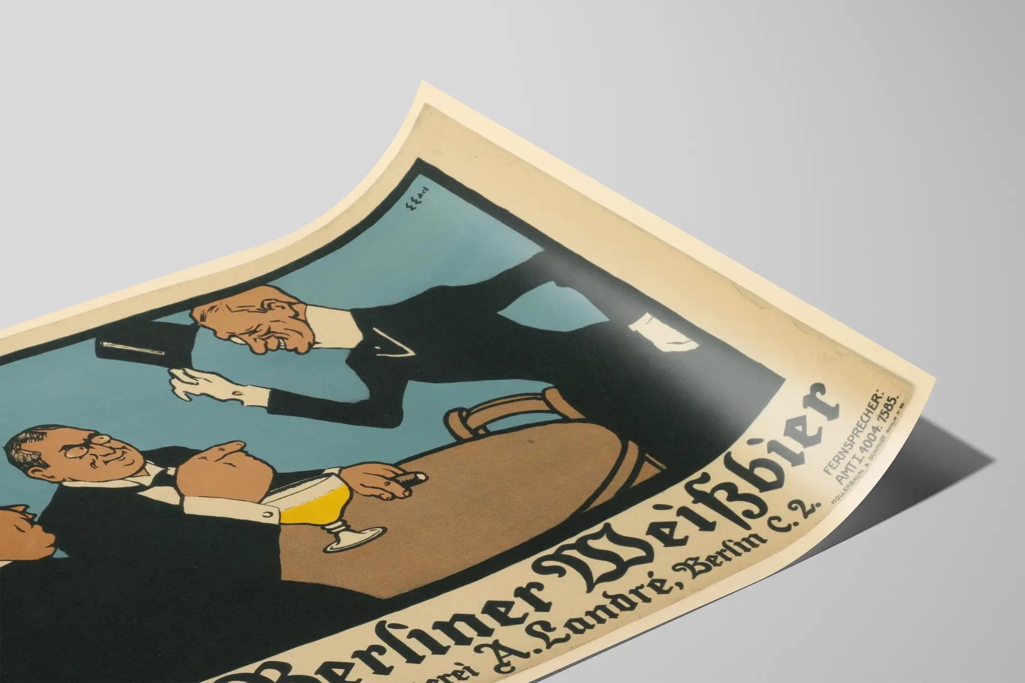 Dieses vintage Werbeplakat zeigt eine gesellige Szene bei einem Glas Weißbier, das echte Berliner Weißbier der Brauerei Weißbierbrauerei A. Landré in Berlin. Der grafische Stil und die Farbauswahl erinnern authentisch an klassische Werbeplakate und vermitteln die Atmosphäre der Verkostungsstätten jener Zeit. Dieses Poster ist ideal für eine originelle Wanddekoration und verleiht Ihrem Interieur einen retro- und kulturvollen Akzent. Das Bild zeigt zwei Männer in eleganter Kleidung, die sich mit einem ebenfalls formell gekleideten Kellner unterhalten, was eine anspruchsvolle und entspannte Stimmung suggeriert. Das leuchtend gelbe, schaumige Bierglas auf dem Tisch zieht natürlich die Aufmerksamkeit auf sich und hebt das Flaggschiffprodukt der Brauerei hervor. Der deutsche Text am unteren Rand des Plakats weist klar auf die Produktwerbung hin und verleiht diesem dekorativen Bild eine interessante historische und typografische Dimension. Perfekt für ein Vintage-Ambiente in einer Bar, Küche oder einem Wohnzimmer – dieses Werbeplakat ist ein einzigartiges Wanddekorationselement, das Liebhaber von Bier und altem Grafikdesign begeistern wird. Verleihen Sie Ihren Wänden einen Hauch Geschichte aus der Welt der Berliner Brauereien mit diesem eleganten und charaktervollen Plakat.
