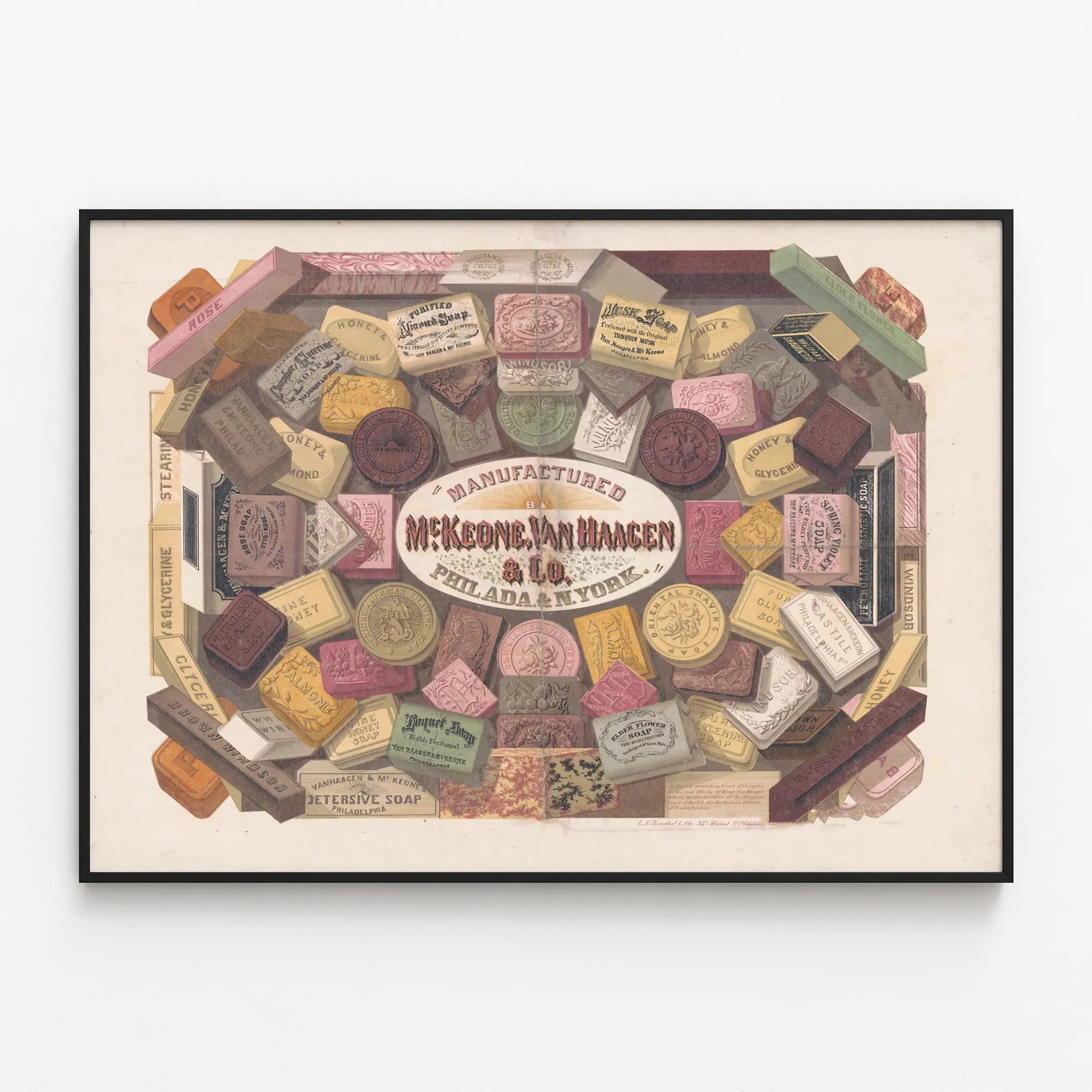 Dieses Vintage-Poster zeigt eine elegante und farbenfrohe Komposition von Seifen, hergestellt von McKeone Van Haagen & Co, einem Unternehmen mit Sitz in Philadelphia und New York. Es entdeckt eine Vielzahl von Seifen in unterschiedlichen Formen, Stangen, Rechtecken und Runden, die jeweils kunstvoll mit verschiedenen Inschriften und Mustern illustriert sind. Die Seifen tragen Namen wie „Rose Soap“, „Honey & Almond“, „Musk Soap“, „Oriental Shaving Soap“ oder „Elder Flower Soap“, die eine breite Palette an Düften und raffinierten kosmetischen Eigenschaften andeuten. Diese Fächerform-Komposition hebt die Vielfalt der Produkte in einem typischen Stil alter Werbeplakate hervor, der grafische Feinheit mit visueller Fülle verbindet. Die um die Seifen verwendete alte Schriftart, insbesondere im zentralen Text „Manufactured by McKeone Van Haagen & Co. Philada. & N. York.“, verstärkt den Retro- und Authentizitätscharakter dieser Wanddekoration. Dieses Poster ist ideal für Liebhaber vintage Dekorationen, die ihrem Interieur einen Hauch von Geschichte und Eleganz verleihen möchten. Durch seinen Retro-Stil eignet sich dieses Plakat perfekt zur Hervorhebung in einem Badezimmer oder einem Raum für Wohlbefinden und Schönheit. Sein detailliertes, farbenfrohes Format bietet einen originellen und charaktervollen Blickfang an der Wand, zwischen Moderne und Nostalgie. Die verschiedenen Seifenblöcke und ihre Etiketten stellen eine schöne Verbindung zwischen Werbung und dekorativer Kunst dar, was diesem Poster einen zeitlosen Charme verleiht, der bei Liebhabern authentischer Wanddekorationen geschätzt wird. Dieses Retro-Bild lädt dazu ein, die Welt der traditionellen Seifen in einem sorgfältig gestalteten grafischen Stil neu zu entdecken, ideal zur Bereicherung einer Sammlung vintage Plakate oder zur Schaffung eines thematischen Dekorationsensembles in einem modernen oder klassischen Interieur.