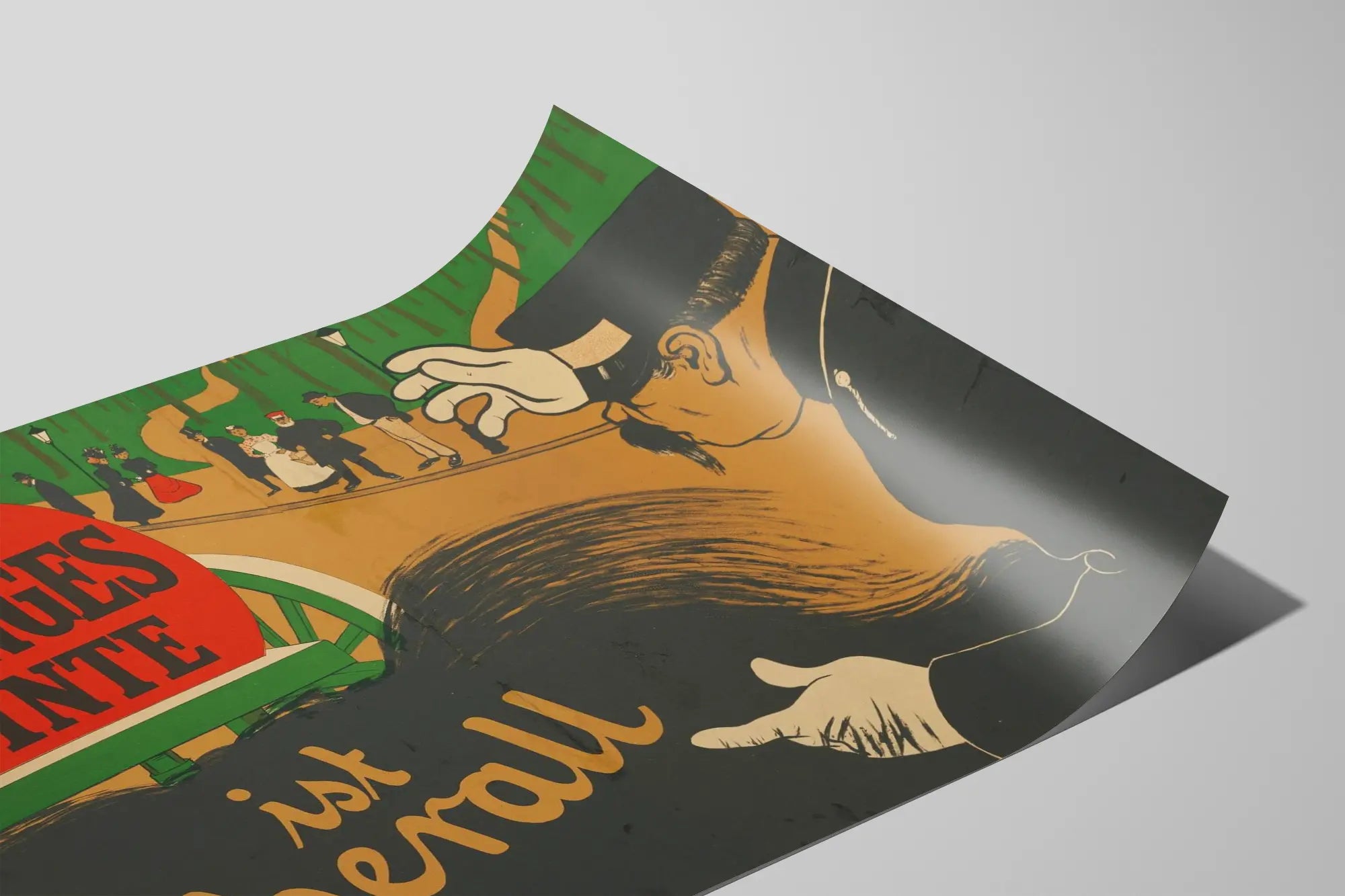 Dieses Vintage-Werbeplakat RUNGE TINTE ist ein bemerkenswertes Stück für jede Wanddekoration im Retro- oder Historienstil. Das Design zeigt einen leuchtend roten Wagen mit dem Namen RUNGE TINTE auf einem grünen Hintergrund, der einen zentralen Blickfang bildet, der durch seinen auffälligen Kontrast ins Auge fällt. Ebenfalls sichtbar ist eine Gruppe von Figuren in altertümlicher Kleidung, typisch für eine vergangene Epoche, was diesem Plakat einen authentischen Charme und eine nostalgische Atmosphäre verleiht. Die Komposition zeigt einen Polizisten oder Wächter, der aufmerksam auf den Wagen blickt, was die Idee verstärkt, dass das Produkt RUNGE TINTE überall ist, wie die Aufschrift "ist überall" auf Deutsch bedeutet. Dieses Plakat ist die ideale Wahl für diejenigen, die ihrer Inneneinrichtung einen künstlerischen und retrohaften Akzent verleihen möchten, in einem Stil, der an alte europäische Werbeanzeigen erinnert. Es kann als dekoratives Poster in Räumen verwendet werden, die auf Vintage-Wanddekoration spezialisiert sind, in Cafés, Salons oder Büros, die eine einzigartige und auffällige Dekoration hervorheben möchten. Das einfache, aber wirkungsvolle Design mit kräftigen Farben und illustrativem Stil verleiht diesem Plakat einen originellen Charakter, der sich perfekt in eine Welt der Wandgestaltung einfügt, die sowohl klassisch als auch populär ist. Das Werbeplakat RUNGE TINTE wird zweifellos zu einem zentralen Dekorationselement in einem Raum, das Authentizität und einen Hauch visueller Geschichte vermittelt und gleichzeitig die Kunst des Werbegrafikdesigns des frühen 20. Jahrhunderts hervorhebt.