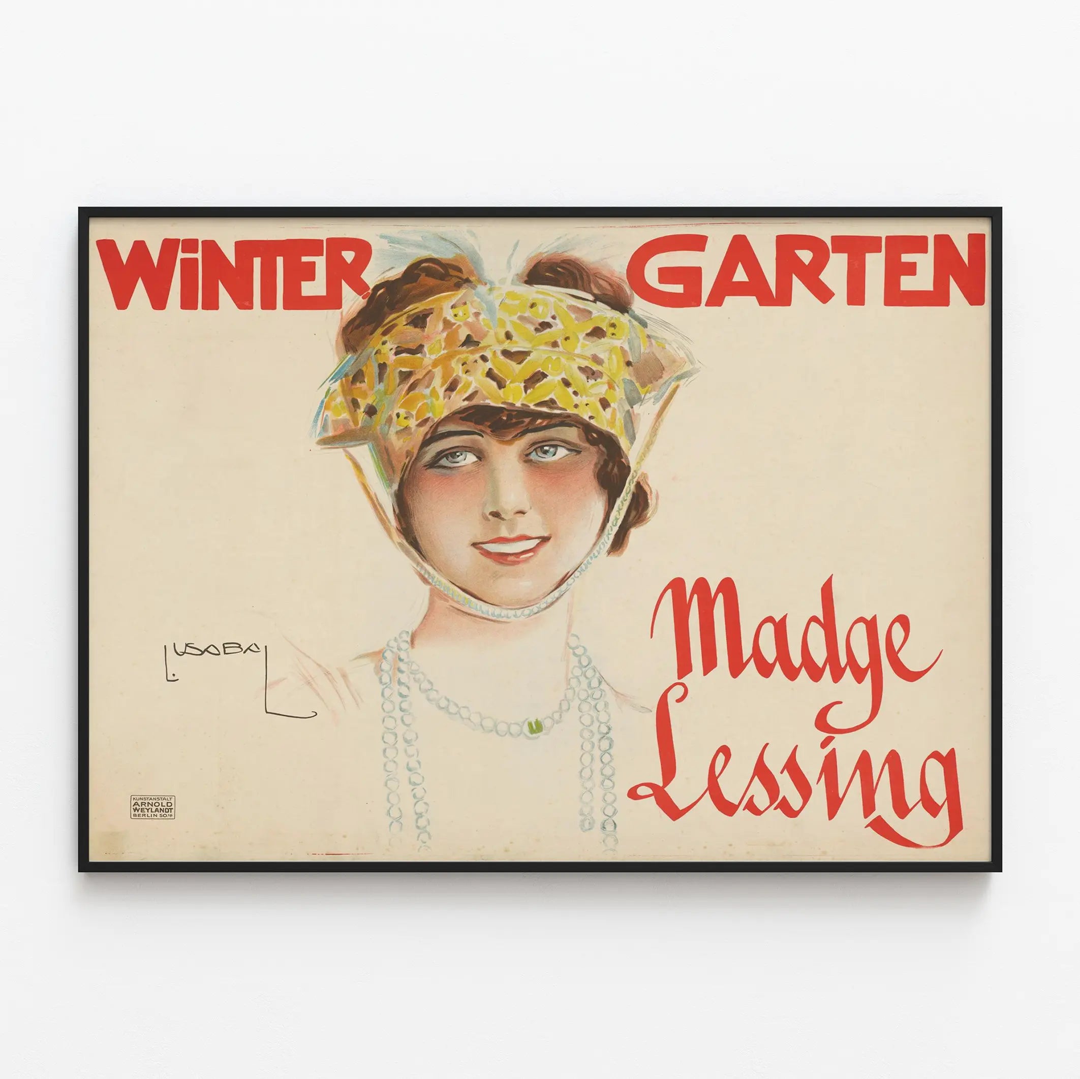 Der leuchtend rote Text „WINTER GARTEN“ oben auf dem Poster lenkt die Aufmerksamkeit auf die Szene, während der Name „Madge Lessing“ in stilisierten Buchstaben auf der rechten Seite geschrieben ist und eine perfekte visuelle Balance in der Komposition bietet. Dieses Poster ist auf einem hellbeigen Hintergrund gedruckt, der einen harmonischen Kontrast zu den grafischen Elementen schafft und seinen Vintage-Charme unterstreicht.