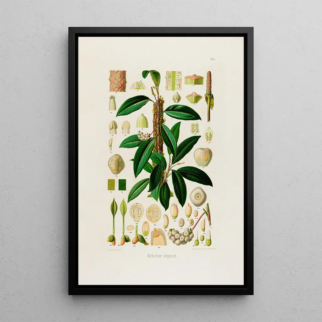 Die kunstdruck Aroideae Maximilianae Pl08 evoziert ein üppiges Universum, in dem die Natur in ihrer ganzen Pracht erstrahlt. Die lebendigen Grüntöne verschmelzen mit Nuancen von Gelb und Weiß und schaffen ein lebendiges Gemälde, das den Blick fesselt. Die vom Künstler verwendete Gravurtechnik offenbart detaillierte Feinheiten der Blätter und Blüten und vermittelt eine fast greifbare Atmosphäre. Jedes Element scheint zu atmen und lädt den Betrachter ein, in eine faszinierende botanische Welt einzutauchen, in der die Zartheit der Formen und die Farbvielfalt die Vielfalt der Flora feiern.