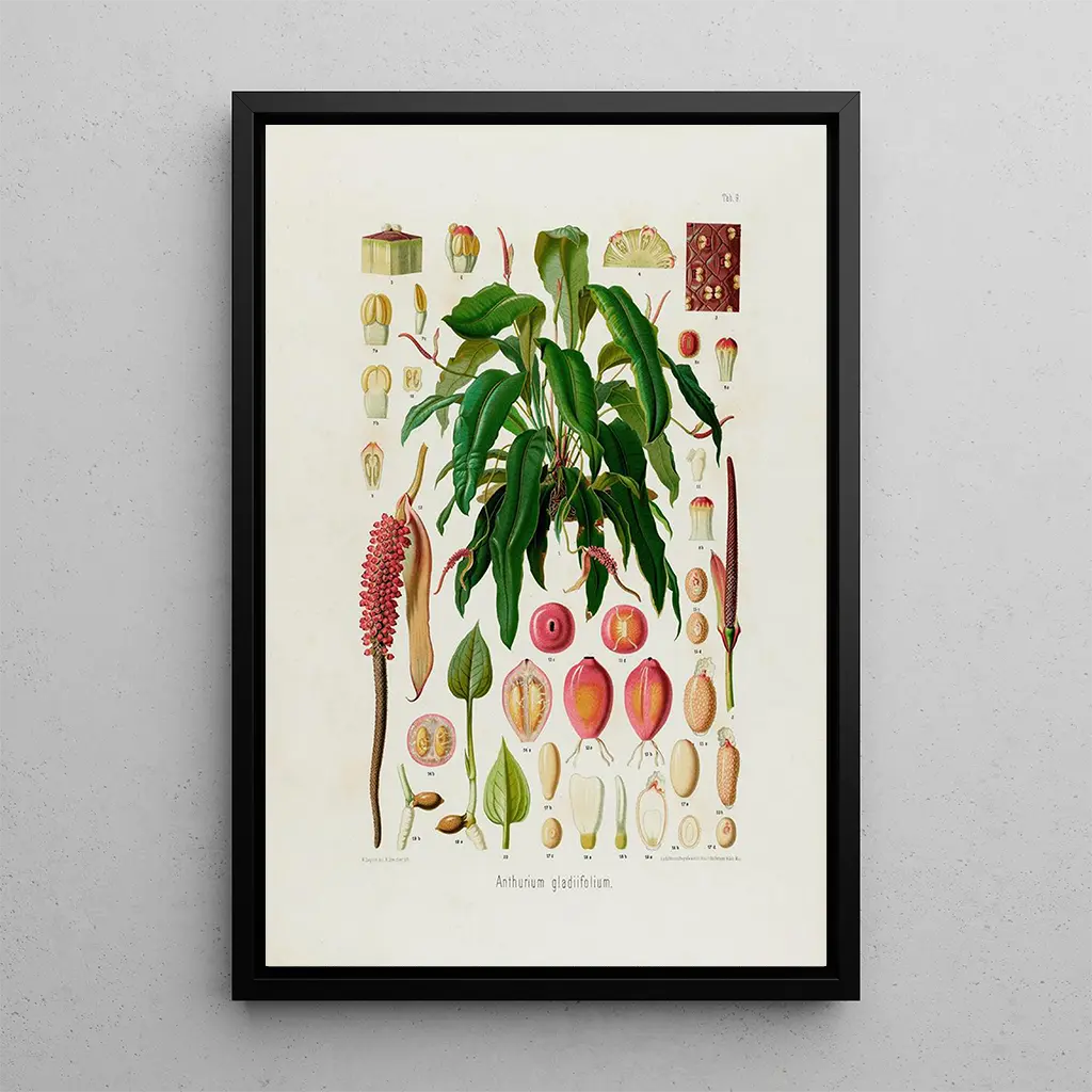 Aroideae Maximilianae Pl09 : eine Reise ins Herz der Flora Die kunstdruck Aroideae Maximilianae Pl09 entführt uns in einen üppigen Garten, in dem jedes Detail der Pflanze hervorgehoben wird. Die reichen und vielfältigen Farben, die vom tiefen Grün bis zu leuchtenden Weißtönen reichen, schaffen eine harmonische Komposition, die die Aufmerksamkeit auf sich zieht. Die Gravurtechnik ermöglicht es, die Textur der Blätter und die Zartheit der Blumen sichtbar zu machen, wodurch das Werk eine lebendige und dynamische Atmosphäre erhält. Dieses Gemälde lädt dazu ein, die Schönheit der Natur zu erkunden, und bietet eine visuelle Erfahrung, die die Sinne weckt und die Fantasie anregt. Heinrich Wilhelm Schott : ein Künstler im Dienste der Wissenschaft Heinrich Wilhelm Schott, Botaniker und Illustrator des 19. Jahrhunderts, prägte seine Zeit durch seinen einzigartigen Ansatz in der Botanik. Sein Werk ist in einem Kontext entstanden, in dem die Erforschung exotischer Pflanzen im Aufschwung war, und er konnte diese Essenz durch seine Illustrationen einfangen. Beeinflusst von den wissenschaftlichen Fortschritten seiner Zeit, kombinierte Schott Präzision und Ästhetik und ehrte die Vielfalt der Pflanzenarten. Aroideae Maximilianae Pl09 ist ein perfektes Beispiel für sein Talent und spiegelt sein Engagement wider, die Schönheit der Natur zu verewigen und gleichzeitig zum botanischen Wissen beizutragen. Eine dekorative Anschaffung mit vielfältigen Vorzügen Der kunstdruck Aroideae Maximilianae Pl09 ist eine wertvolle Ergänzung für jede Innendekoration, sei es ein Wohnraum, ein Büro oder ein Schlafzimmer. Seine Druckqualität garantiert eine außergewöhnliche Detailtreue und verleiht gleichzeitig einen Hauch von Eleganz und Ruhe. Mit diesem Gemälde schenken Sie Ihrem Interieur ein Stück, das die natürliche Schönheit widerspiegelt und zur Betrachtung einlädt. Dieses Bild ist viel mehr als nur ein dekoratives Element; es wird zu einer Inspirationsquelle und einer ständigen Erinnerung an die Pracht der Pflanzenwelt.