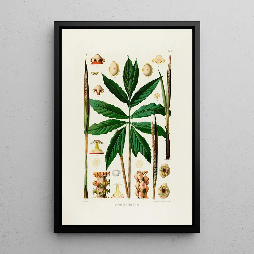 Aroideae Maximilianae Pl25 : eine faszinierende botanische erkundung Das werk "Aroideae Maximilianae Pl25" von Heinrich Wilhelm Schott ist eine wahre ode an die schönheit der natur. Diese botanische illustration, mit bemerkenswerter präzision gefertigt, hebt die zarten details der blätter und blüten der pflanze hervor. Die lebendigen farben, von tiefgrün bis strahlend gelb, schaffen eine lebendige und dynamische atmosphäre. Die gravurtechnik, die von Schott verwendet wird, ermöglicht es, jede nervatur und kontur mit beeindruckender klarheit wiederzugeben, und bietet dem betrachter eine vollständige immersion in das pflanzenuniversum. Dieses werk lädt zur kontemplation und zum schätzen der vielfältigkeit der lebensformen auf unserem planeten ein. Heinrich Wilhelm Schott : ein pionier der illustrierten botanik Heinrich Wilhelm Schott, botaniker und illustrateur des 19. jahrhunderts, spielte eine wesentliche rolle bei der dokumentation der pflanzenarten. Geboren 1794, widmete er sein leben der studie der pflanzen, insbesondere der familien der Aroideae. Seine arbeit wurde durch die botanischen erkundungen seiner zeit beeinflusst, in denen die entdeckung neuer arten im vollen gange war. Schott arbeitete mit zahlreichen wissenschaftlern zusammen und veröffentlichte mehrere werke, darunter "Tropenflora", das zum verständnis der tropischen pflanzen beitrug. Sein künstlerischer und wissenschaftlicher ansatz machte ihn zu einer ikonischen figur im bereich der botanischen illustration und prägte die geschichte von kunst und wissenschaft. Eine dekorative anschaffung mit vielfältigen vorteilen Der kunstdruck von "Aroideae Maximilianae Pl25" ist ein dekoratives stück, das jeden raum bereichern kann, sei es ein wohnzimmer, ein büro oder ein schlafzimmer. Seine druckqualität und die treue zu den originalen details machen ihn zur idealen wahl für botanische oder kunstliebhaber. Dieses bild zieht die aufmerksamkeit auf sich und regt gespräche an, während es eine natur-ästhetik in ihr zuhause bringt. Durch die integration dieses leinwandbildes in ihre dekoration fügen sie nicht nur ein kunstwerk hinzu, sondern auch ein element der ruhe und eleganz in ihre umgebung.