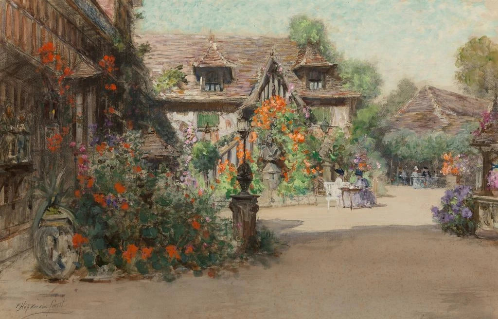 „L'Auberge de Will“ von Francis Hopkinson Smith entführt uns in eine malerische Umgebung, in der Architektur und Natur harmonisch aufeinandertreffen. Dieses Kunstwerk zeigt eine einladende auberge, umgeben von Grünflächen, und vermittelt eine warme, nostalgische Atmosphäre. Die sanften Farben und die detaillierte Ausführung zeugen von besonderer Sorgfalt bei der Komposition. Das Licht spielt eine entscheidende Rolle, beleuchtet die Fassaden und schafft zarte Schatten, die der Szene Tiefe verleihen. Das Werk lädt dazu ein, sich die Geschichten und Begegnungen vorzustellen, die sich in diesem geselligen Raum abspielen, und macht jeden Blick zu einem Moment der Entdeckung.