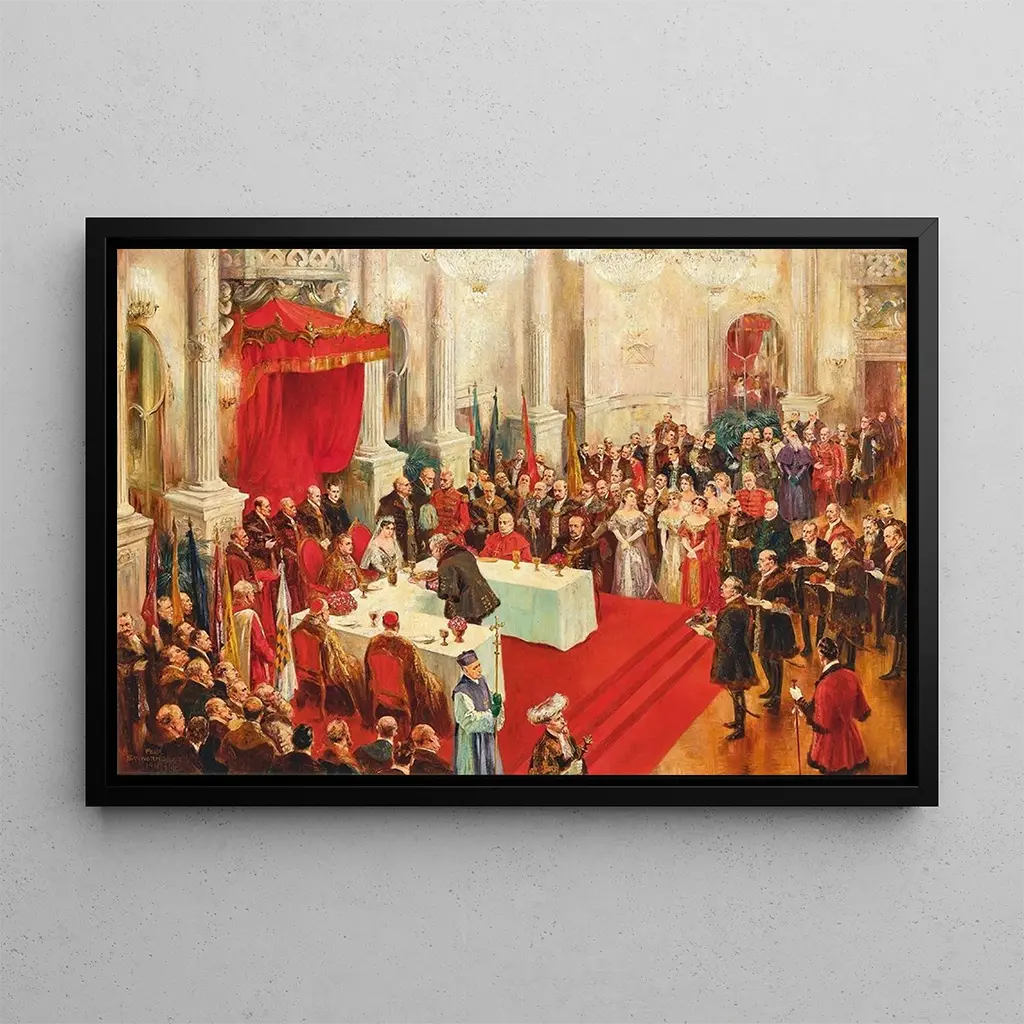 Der kunstdruck des "Krönungsbanketts" ist ein dekoratives Stück, das jeden Raum verschönern kann, sei es ein Wohnzimmer, ein Büro oder ein Schlafzimmer. Seine Druckqualität und die Treue zu den Originaldetails machen ihn zur idealen Wahl für Kunstliebhaber und Geschichtsbegeisterte. Mit seinem unbestreitbaren ästhetischen Reiz verleiht dieses Bild Ihrem Interieur Eleganz und Raffinesse und regt gleichzeitig Gespräche über königliche Traditionen und bedeutende historische Ereignisse an.