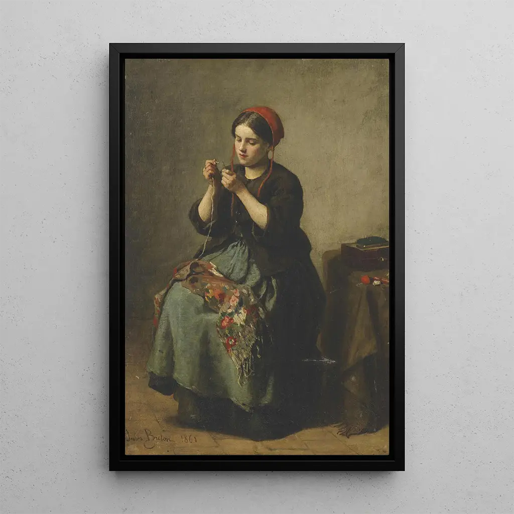 Dans cette œuvre touchante, Jules Breton dépeint une paysanne concentrée sur son ouvrage, enfilant une aiguille avec soin. La lumière douce qui baigne la scène met en valeur les textures des vêtements et les détails du visage, révélant une beauté authentique et une force tranquille. Les couleurs pastel, délicates et harmonieuses, créent une atmosphère chaleureuse, invitant le spectateur à apprécier la simplicité de ce moment. La composition, centrée sur la figure de la paysanne, souligne l'importance du travail manuel et la dignité des tâches quotidiennes, faisant de cette toile un véritable hommage à la vie rurale.
