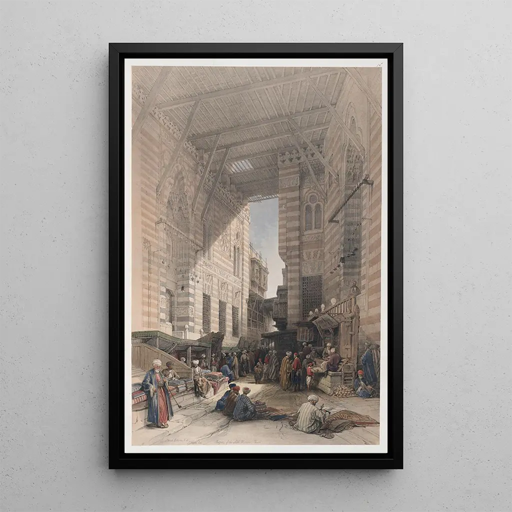 In dieser kunstdruckversion des Gemäldes "Bazar des marchands de soie Le Caire" taucht David Roberts in das lebendige Treiben eines belebten Marktes ein. Die leuchtenden Farbtöne der Stoffe verschmelzen mit den warmen Nuancen der Sonne, die die engen Gassen streichelt. Die Aquarelltechnik, meisterhaft angewandt, verleiht dem Werk eine Leichtigkeit und Fließfähigkeit, die die vibrierende Atmosphäre dieses ikonischen Ortes fast greifbar macht. Jedes Detail, von den Gesichtern der Händler bis zu den Texturen der Stoffe, lädt zu Entdeckung und Staunen ein und versetzt den Betrachter in eine Welt, in der die Zeit stillzustehen scheint.