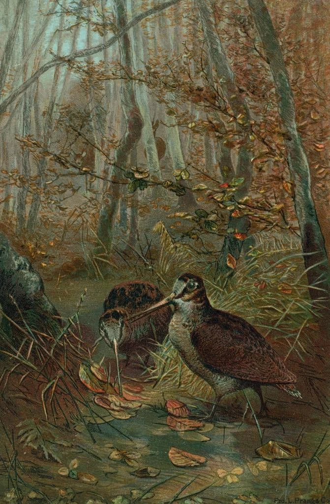 Die bécasse, mit ihrem zarten Gefieder und ihren durchdringenden Augen, ist in einer Haltung dargestellt, die sowohl Anmut als auch Wachsamkeit evoziert. Die erdigen Nuancen ihres Gefieders verschmelzen harmonisch mit der natürlichen Umgebung und schaffen eine ruhige, kontemplative Atmosphäre. John George Wood gelingt es durch seine akribische Technik, das Wesen dieses Vogels einzufangen und seine subtile Schönheit zu offenbaren. Jeder Pinselstrich scheint eine Geschichte zu erzählen, die eines Moments, der im Lauf der Zeit schwebt, in dem Natur und Kunst aufeinandertreffen.