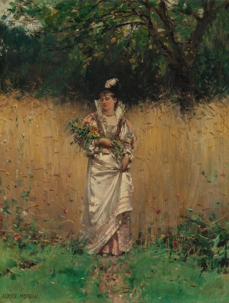 Der Stil von Adrien Moreau zeichnet sich durch einen subtilen Realismus aus, bei dem jedes Detail sorgfältig beobachtet und mit unvergleichlicher Präzision wiedergegeben wird. In "Cueillette de fleurs sauvages" verwendet der Künstler eine Palette lebendiger und natürlicher Farben, die die schimmernden Nuancen der Blumen und des umgebenden Grüns hervorrufen. Die Licht- und Schattenspiele, meisterhaft inszeniert, verleihen der Szene eine beeindruckende Tiefe und laden das Auge ein, die kleinsten Winkel des Werks zu erkunden. Die Komposition, sowohl dynamisch als auch harmonisch, zeugt von einem perfekten Gleichgewicht zwischen den Elementen, bei denen die menschlichen Figuren anmutig in die florale Kulisse eingebettet sind. Diese Symbiose zwischen Mensch und Natur verkörpert eine künstlerische Vision, die tief im Romantizismus verwurzelt ist, sich aber gleichzeitig den impressionistischen Einflüssen öffnet, die zu dieser Zeit aufkommen.