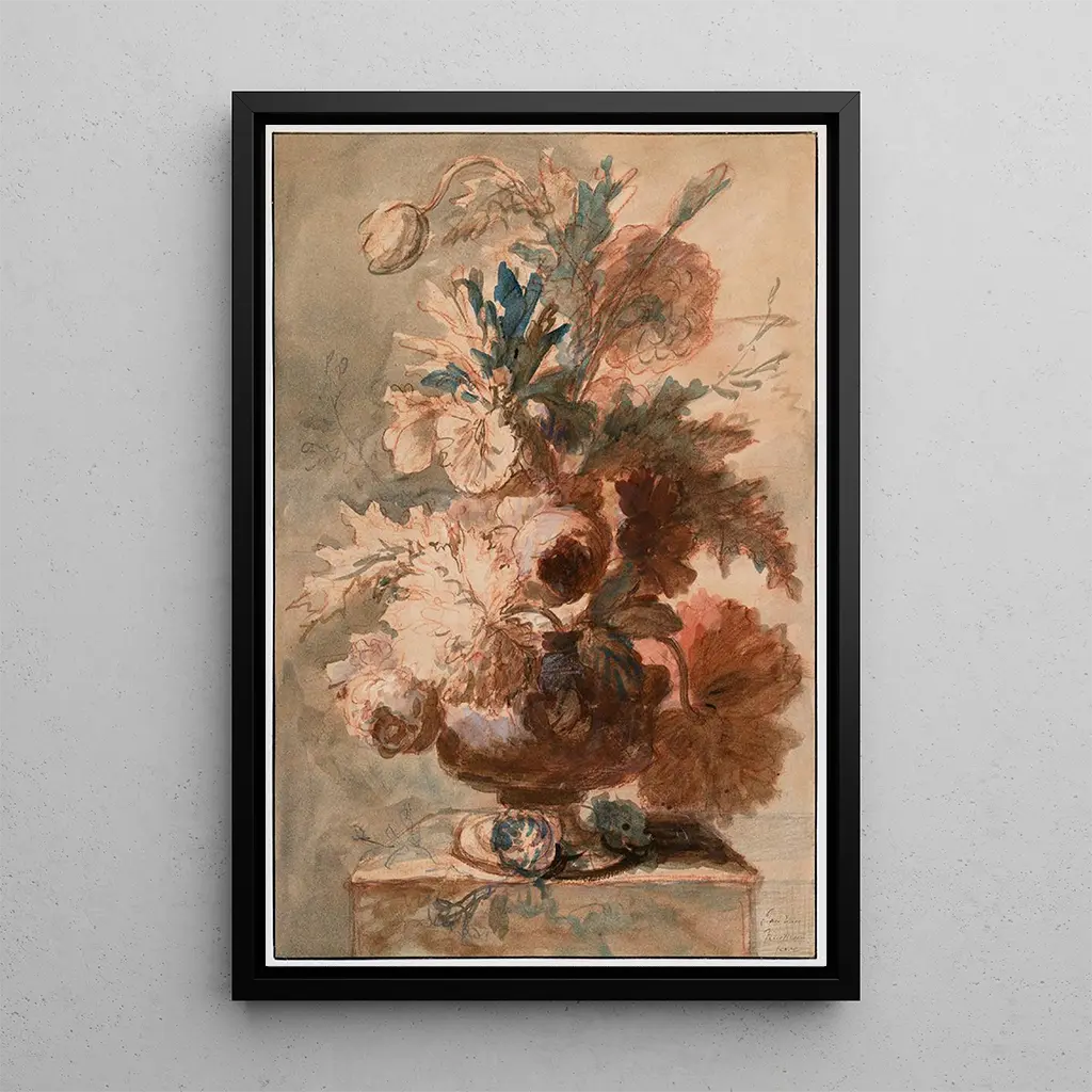 Jan van Huysum, niederländischer Maler des 18. Jahrhunderts, gilt als einer der größten Meister des Genres Stillleben. Beeinflusst von flämischen Traditionen, entwickelte er einen einzigartigen Stil, der Präzision und Poesie vereint. Seine Karriere, geprägt von einer produktiven Schaffensphase, wurde durch die genaue Beobachtung der Natur und eine tiefe Wertschätzung für die vergängliche Schönheit der Blumen genährt. Van Huysum wurde auch von Zeitgenossen wie Rachel Ruysch beeinflusst, doch seine eigenständige Herangehensweise ermöglichte es ihm, sich in der Kunstwelt hervorzuheben. Seine Werke, oft im Auftrag der Aristokratie entstanden, zeugen von der Bedeutung der Natur in der Kunst seiner Zeit und seinem nachhaltigen Erbe.