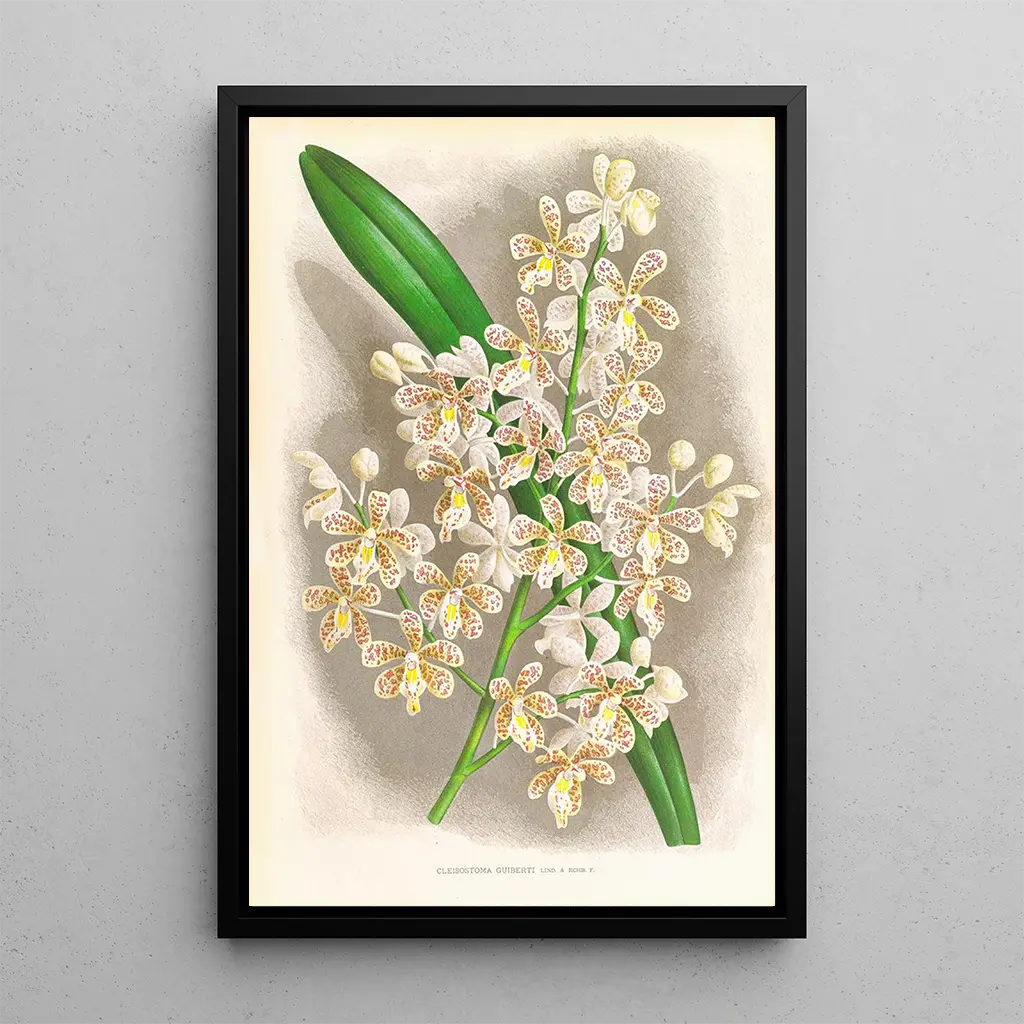 Die kunstdruck von Cleisostoma Guiberti entführt uns in eine üppige Welt, in der die Zartheit der Blumen mit lebendigen Nuancen verschmilzt. Jean Jules Linden, Meister der botanischen Malerei, fängt hier die Anmut der Blütenblätter und die Komplexität der Formen mit bemerkenswerter Präzision ein. Die Farben, die von tiefem Grün bis zu violetten Akzenten reichen, schaffen eine lebendige und beruhigende Atmosphäre. Jedes Detail ist sorgfältig ausgearbeitet und lädt den Betrachter ein, die vergängliche Schönheit der Natur zu bewundern. Dieses Gemälde vermittelt ein Gefühl von Gelassenheit, als befände man sich in einem geheimen Garten, in dem jede Blume eine Geschichte erzählt.