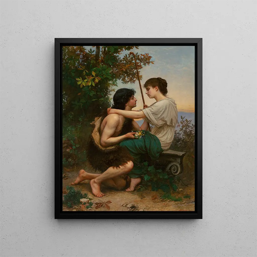 Reproduktion Daphnis et Chloé - Camille Félix Bellanger – Einführung, die fasziniert In der Welt der Kunst überschreiten bestimmte Werke den einfachen Rahmen der Malerei, um zu visuellen Erzählungen voller Emotionen und Poesie zu werden. "Daphnis und Chloé" von Camille Félix Bellanger ist ein leuchtendes Beispiel dafür. Dieses Werk, inspiriert von der mythologischen Liebesgeschichte zwischen Daphnis und Chloé, ruft die Schönheit der Natur und die Reinheit der Gefühle hervor. Beim Betrachten dieses Kunstdrucks wird der Zuschauer sofort in eine Welt versetzt, in der Liebe und Natur miteinander verschmelzen und eine Atmosphäre schaffen, die sowohl ruhig als auch bezaubernd ist. Die Feinheit der Linien und die Farbvielfalt laden zu einer tiefen Betrachtung ein, wodurch jeder Blick auf das Bild einzigartig und persönlich wird. Stil und Einzigartigkeit des Werks Der Stil von Bellanger zeichnet sich durch eine bemerkenswerte Feinheit und eine sorgfältige Detailarbeit aus. In "Daphnis und Chloé" werden die Figuren mit einer Anmut und Leichtigkeit dargestellt, die fast ätherisch wirken. Die Körper der Protagonisten, zart modelliert, verschmelzen harmonisch in einer üppigen Kulisse, in der die Natur eine zentrale Rolle spielt. Licht- und Schatteneffekte sowie die subtilen Nuancen der Farben schaffen eine intime und romantische Atmosphäre. Dieses Werk beschränkt sich nicht nur auf die Darstellung einer Szene; es erzählt eine Geschichte, die eines unschuldigen und leidenschaftlichen Liebes, die in einer idyllischen Landschaft spielt. Jedes Element der Komposition, von den Blättern bis zu den Wasserreflexionen, trägt zur allgemeinen Harmonie bei und macht dieses Stück zu einem wahren Meisterwerk des 19. Jahrhunderts. Der Künstler und sein Einfluss Camille Félix Bellanger, französischer Künstler des 19. Jahrhunderts, hat sich in der Kunstlandschaft seiner Zeit durch sein unbestreitbares Talent und seine einzigartige Vision etabliert. Beeinflusst vom Romantizismus und Neoklassizismus, verstand Bellanger, Tradition und Innovation zu verbinden, und schuf Werke, die das Wesen menschlicher Emotionen einfangen. Seine Arbeit an "Daphnis und Chloé" zeugt von seiner Fähigkeit, mythologische Erzählungen in eindrucksvolle visuelle Darstellungen umzusetzen. Der Einfluss von Bellanger beschränkt sich nicht auf seine Zeit; sein künstlerischer Ansatz inspiriert weiterhin zahlreiche zeitgenössische Künstler, die